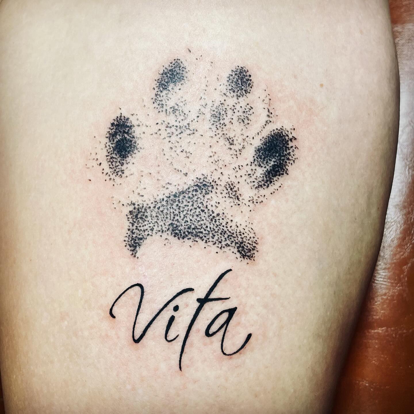 This stunning tattoo features a beautifully detailed dog paw print, showcasing a unique blend of artistry and sentiment. Below the paw, the word “Vita,” meaning life, adds a personal touch, symbolizing the bond between a woman and her beloved pet. For those considering similar designs, incorporating meaningful words or symbols can elevate the tattoo’s significance.