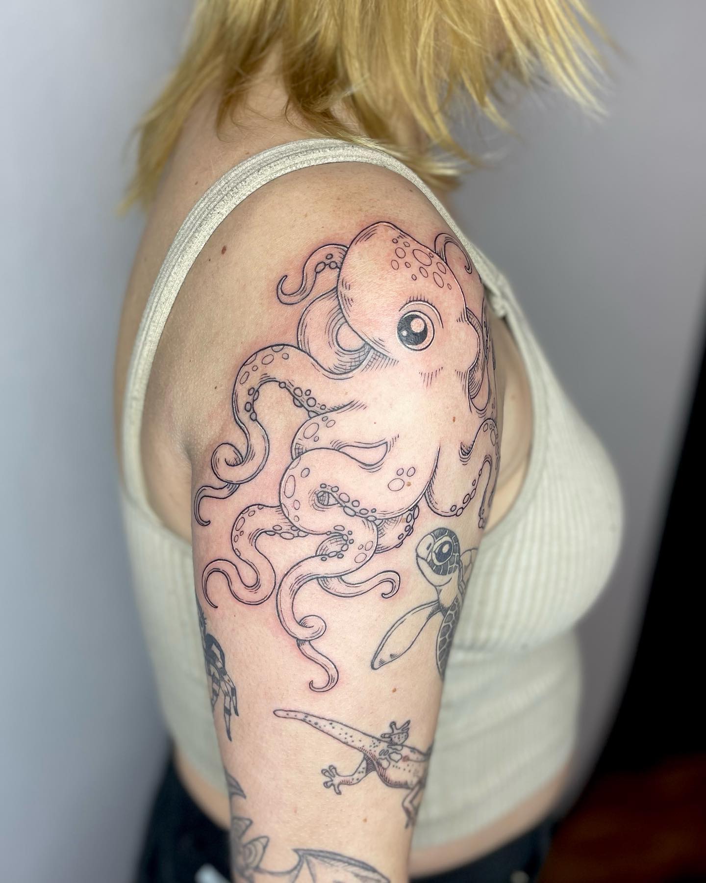 This tattoo showcases a beautifully designed octopus, its graceful tentacles adding an artistic flair to the wearer s arm. The playful lines and charming details create a sense of movement, echoing the fluidity of the ocean. Choosing an octopus tattoo can symbolize adaptability and intelligence, making it a meaningful choice for anyone looking to express their unique personality.
