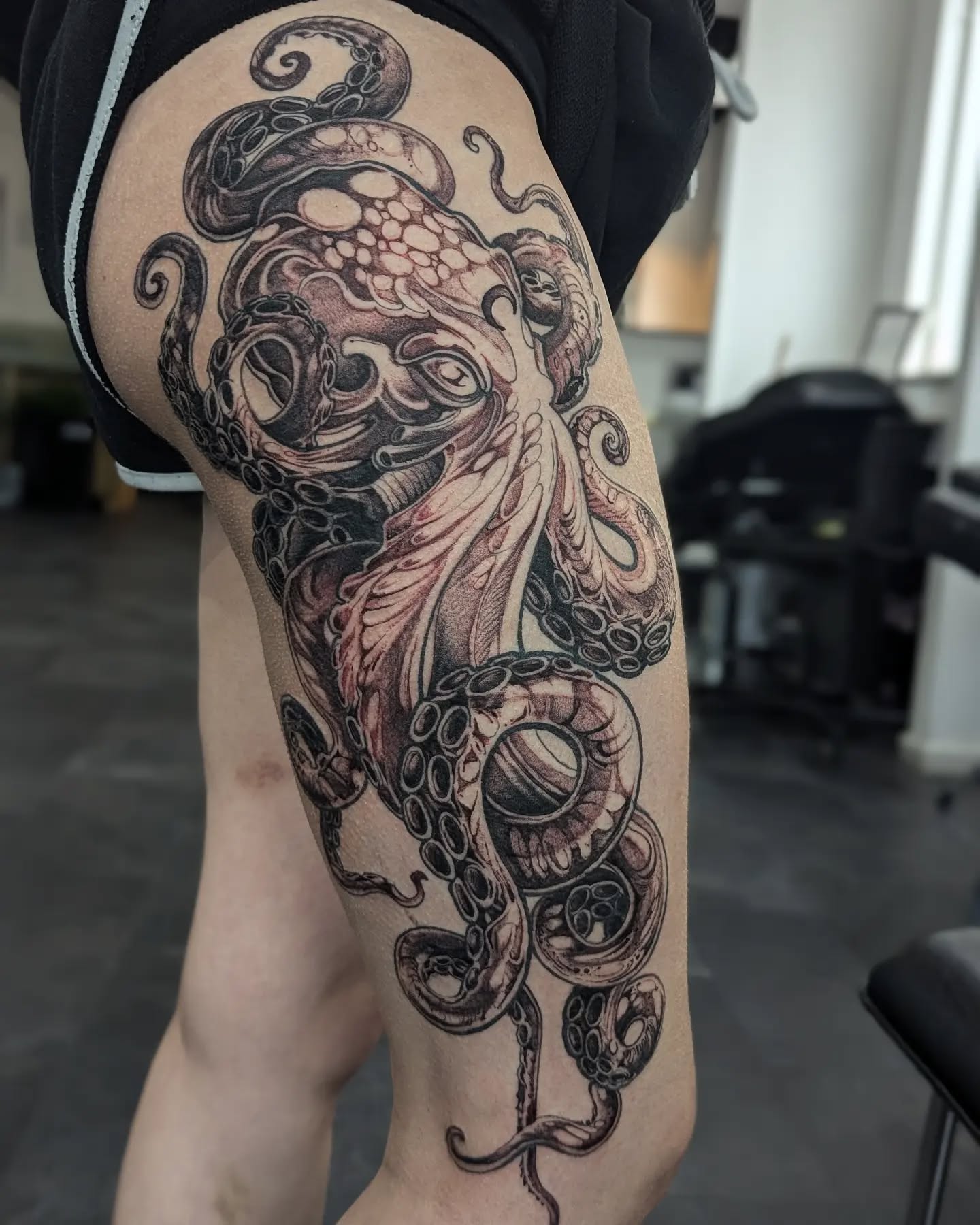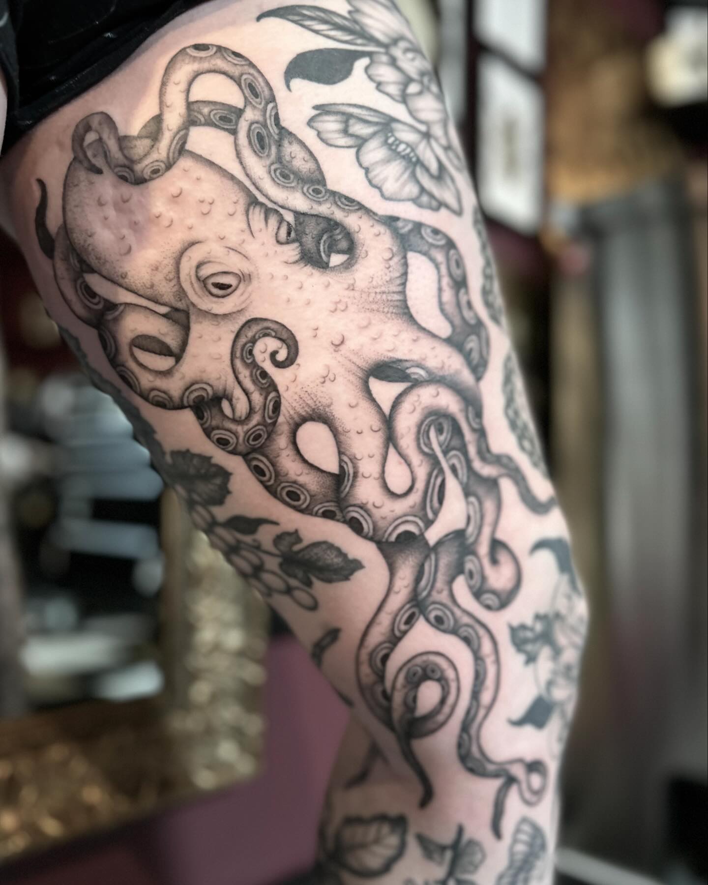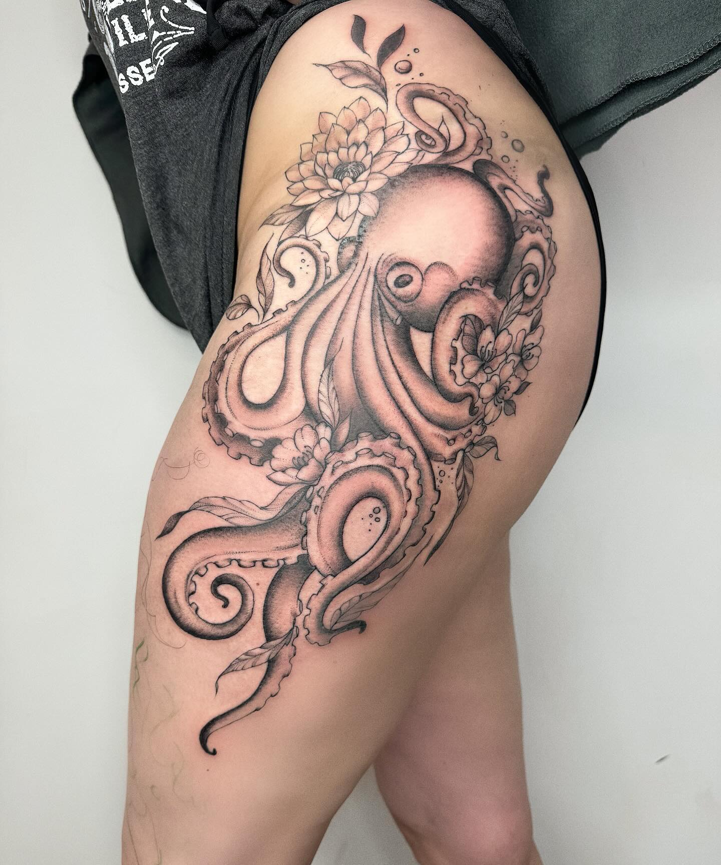 This stunning tattoo showcases a beautifully detailed octopus, its tentacles gracefully wrapping around the thigh. The intricate lines and shading bring the creature to life, making it a striking piece of art. For those considering octopus tattoos, a design like this can symbolize adaptability and intelligence, reflecting the wearer’s unique personality.