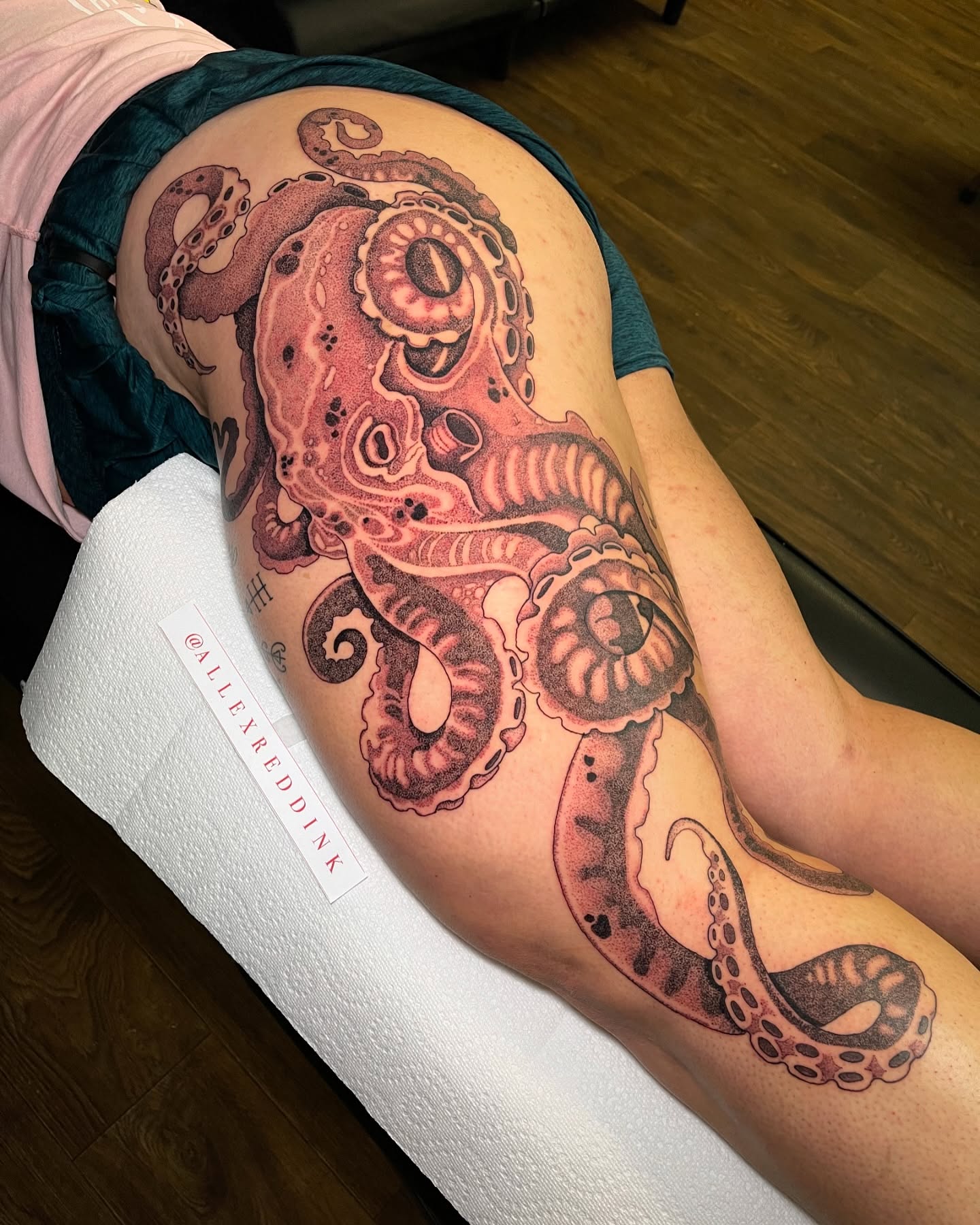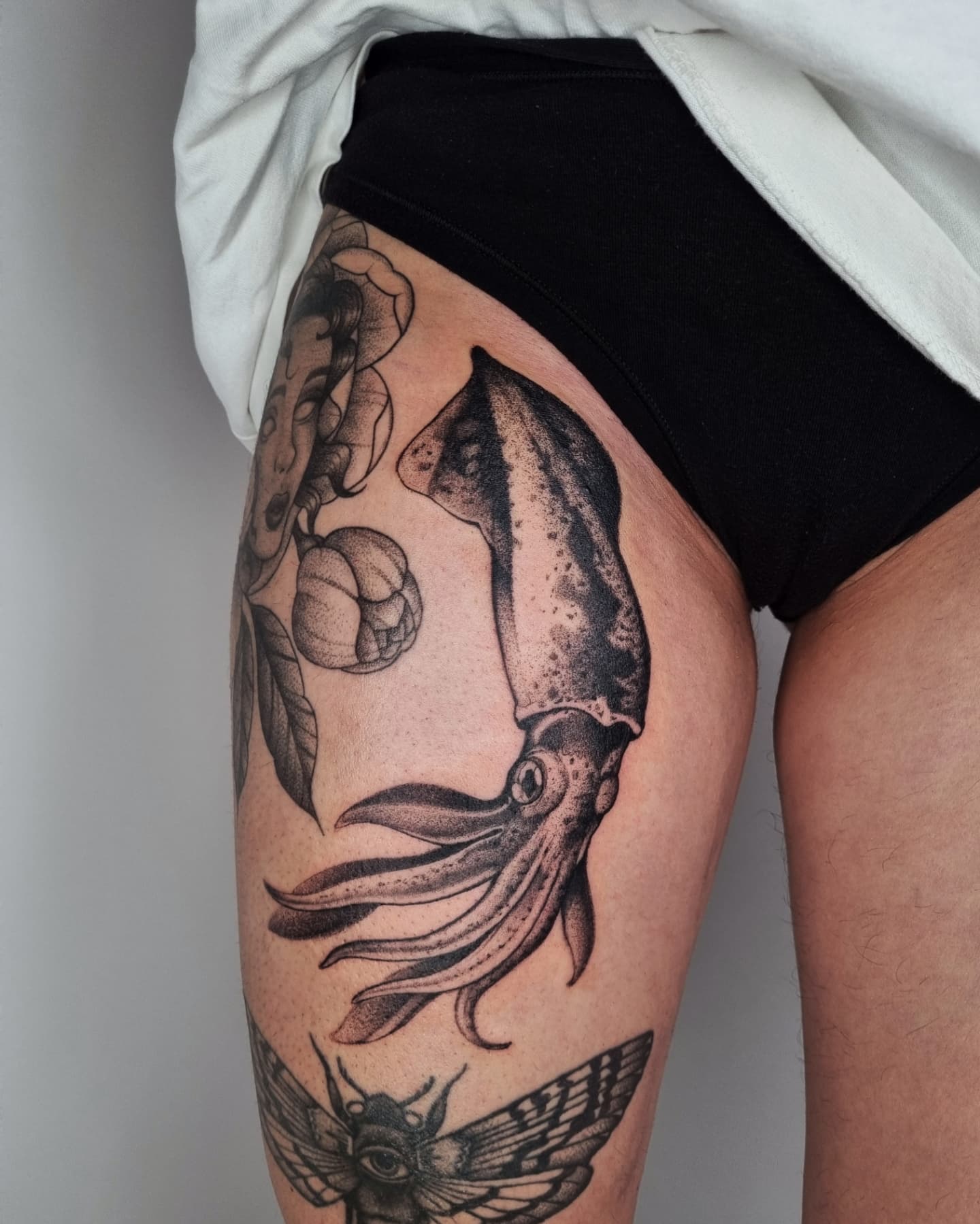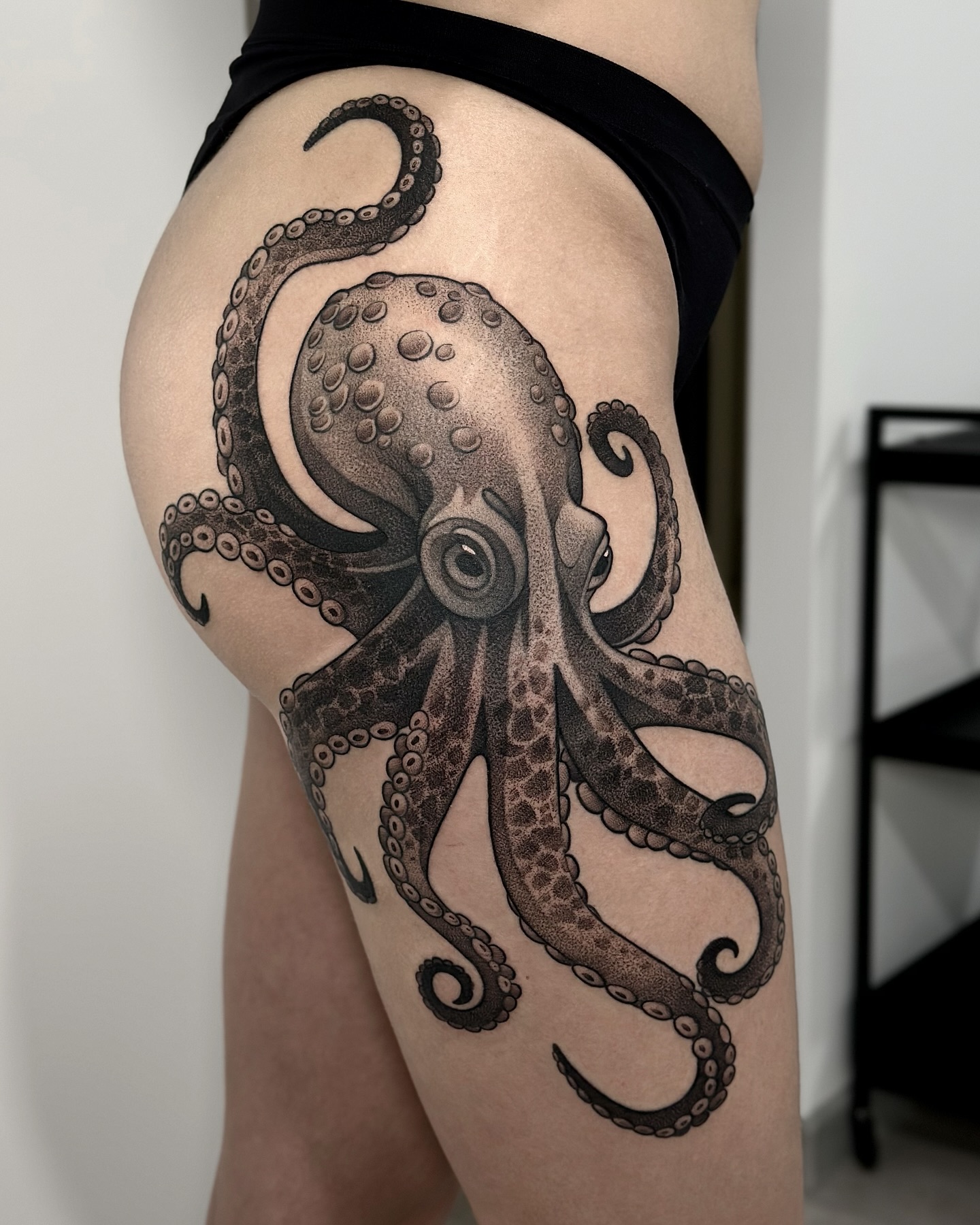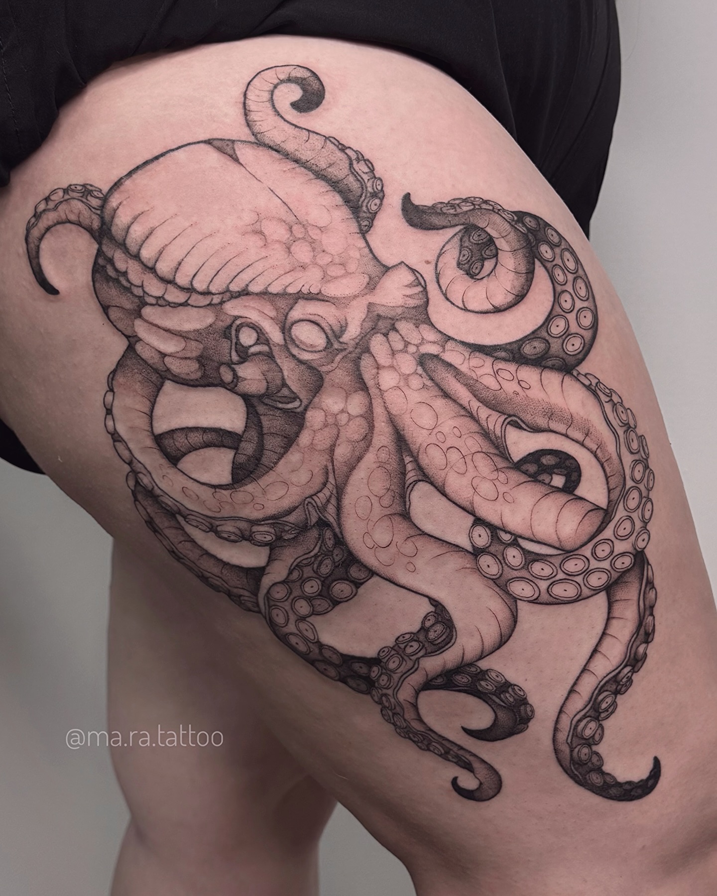 This stunning tattoo showcases a beautifully detailed octopus, its tentacles gracefully wrapping around the thigh. The intricate lines and shading bring the creature to life, making it a striking piece of art. For those considering octopus tattoos, a design like this can symbolize adaptability and intelligence, reflecting the wearer’s unique personality.