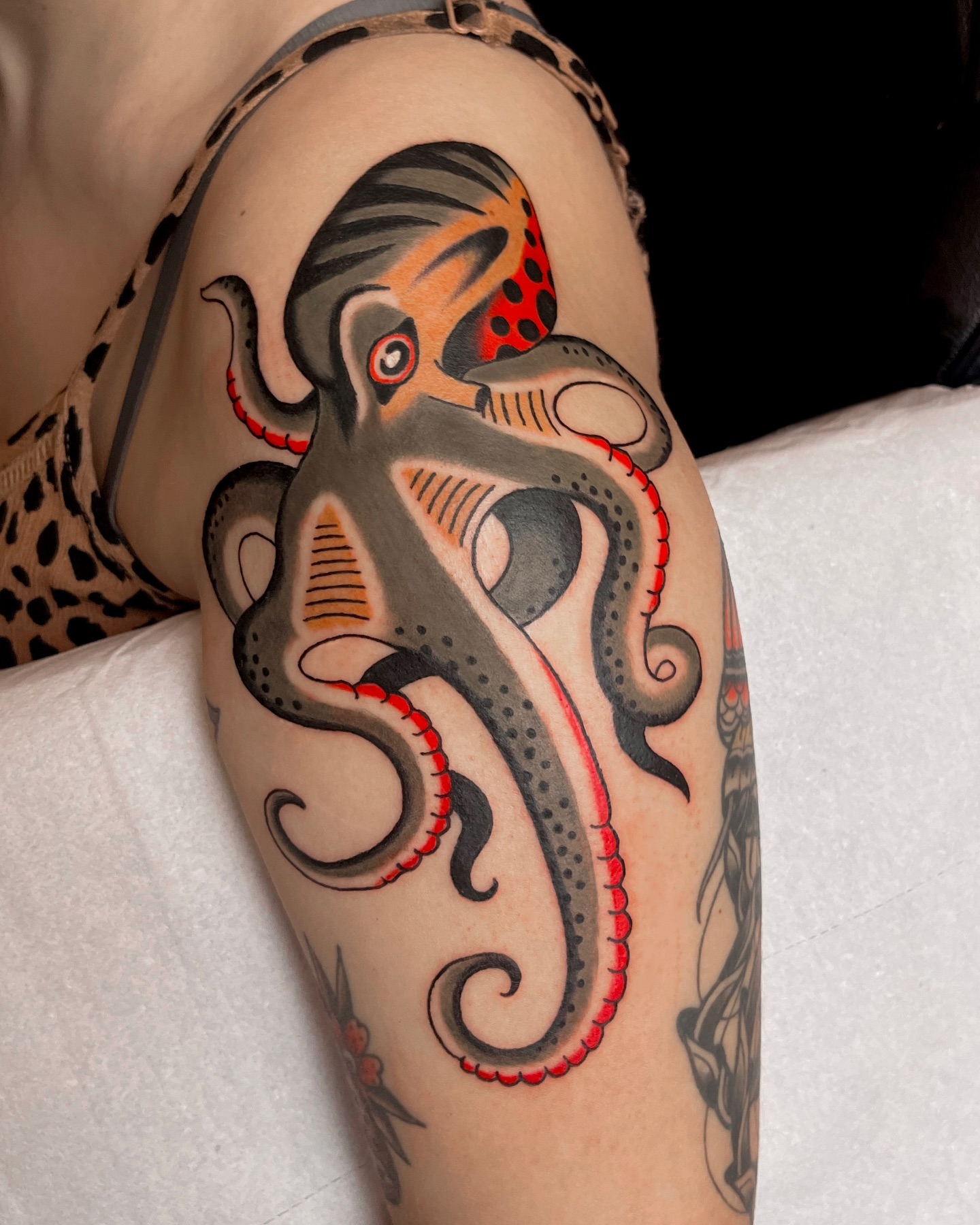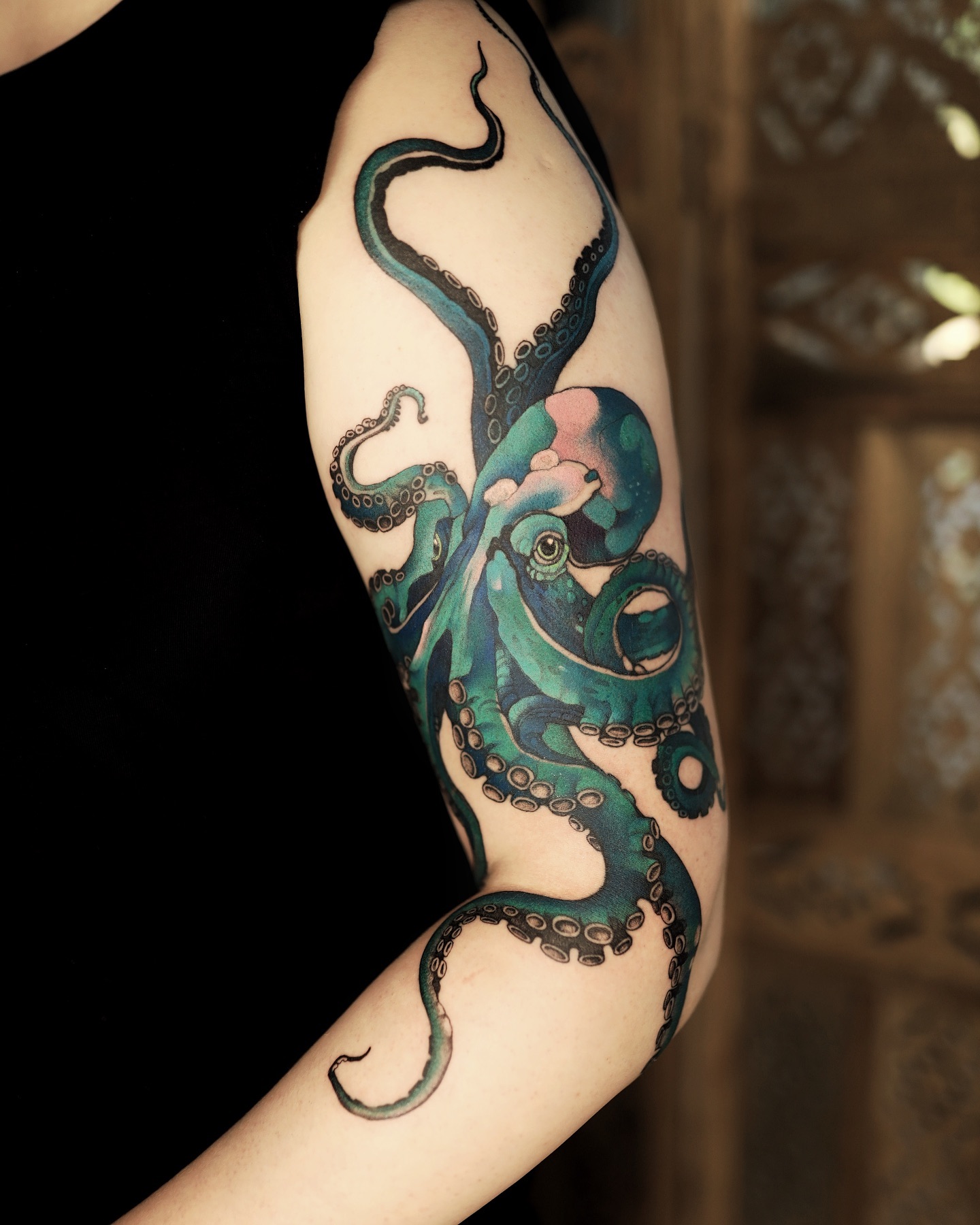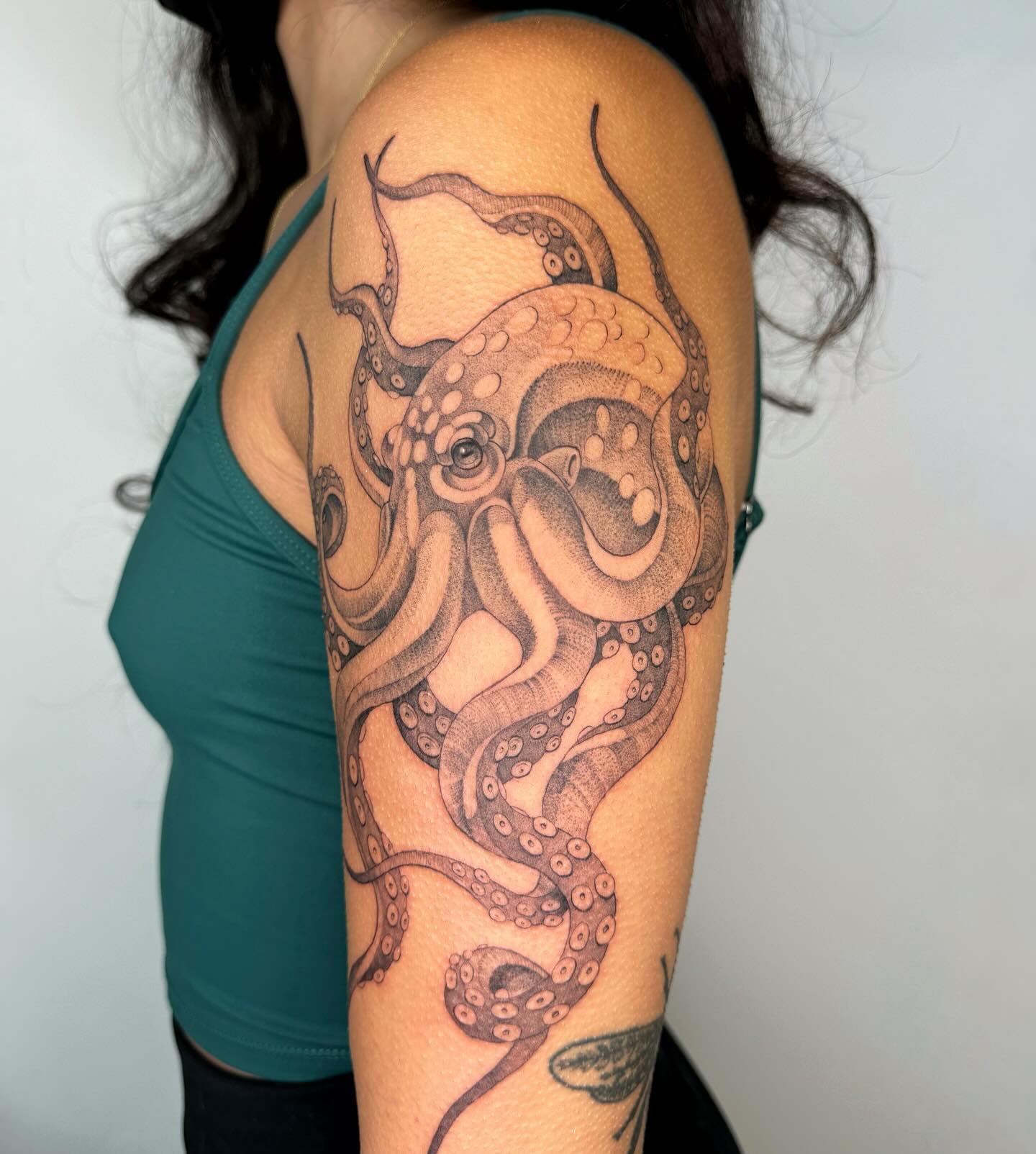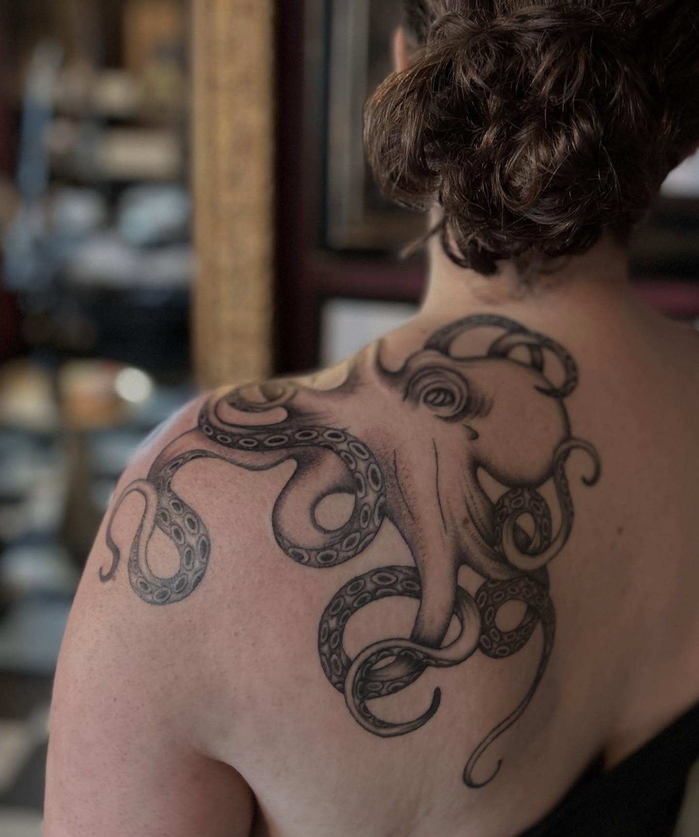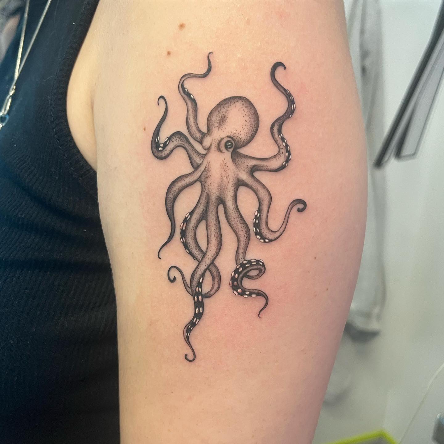 This stunning tattoo showcases an octopus with intricate details that draw the eye. The graceful tendrils wrap around the shoulder, creating a sense of movement and fluidity. For anyone considering an octopus tattoo, choosing a design that reflects personality and style can make it even more special.