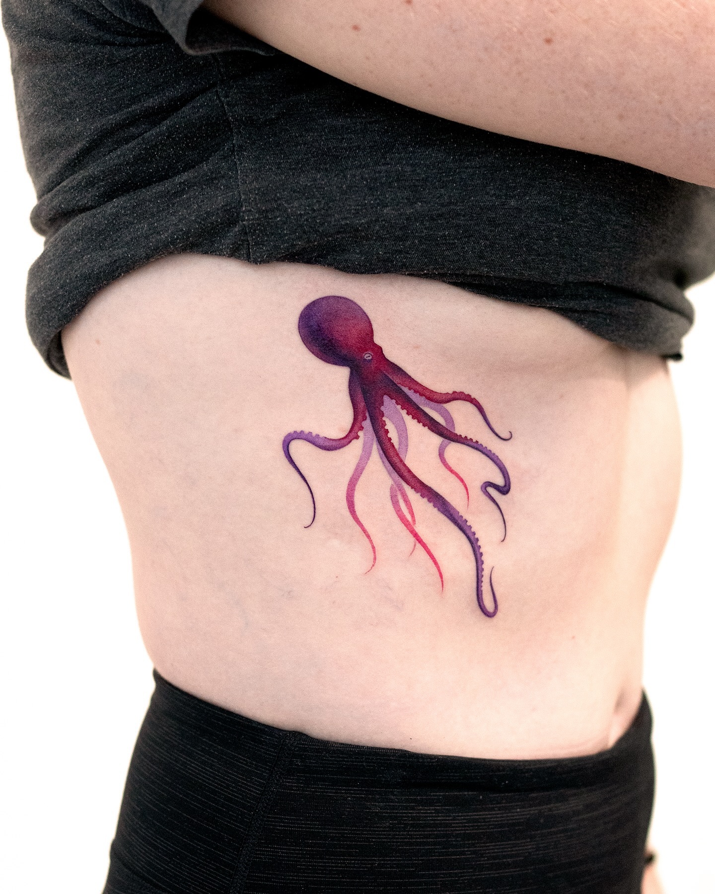This stunning tattoo of an octopus showcases vibrant colors and fluid lines, making it a true piece of art on skin. Placed beautifully on the side, it captures attention and reflects the wearer’s unique personality. For those considering octopus tattoos, choosing bright hues can enhance the overall impact and make the design even more eye-catching.