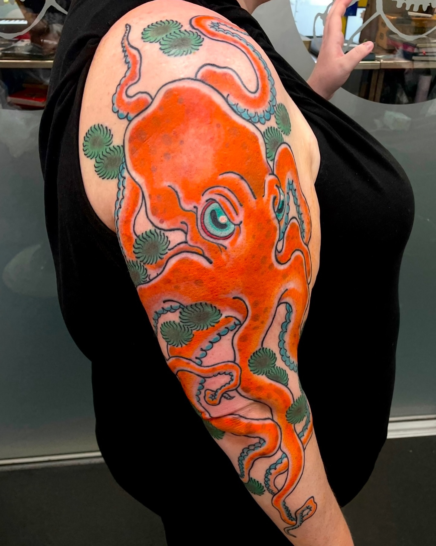 This striking tattoo showcases a vibrant orange octopus wrapped elegantly around the arm, bringing a splash of color and life. The intricate details, like the flowing tentacles and playful green accents, add depth and movement to the design. Choosing an octopus tattoo can symbolize adaptability and intelligence, making it a thoughtful choice for women who appreciate both beauty and meaning in their body art.