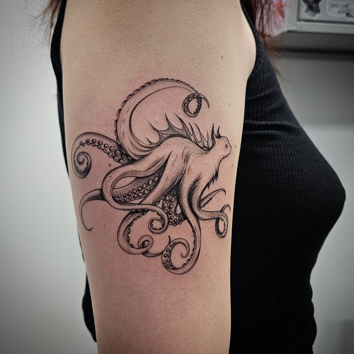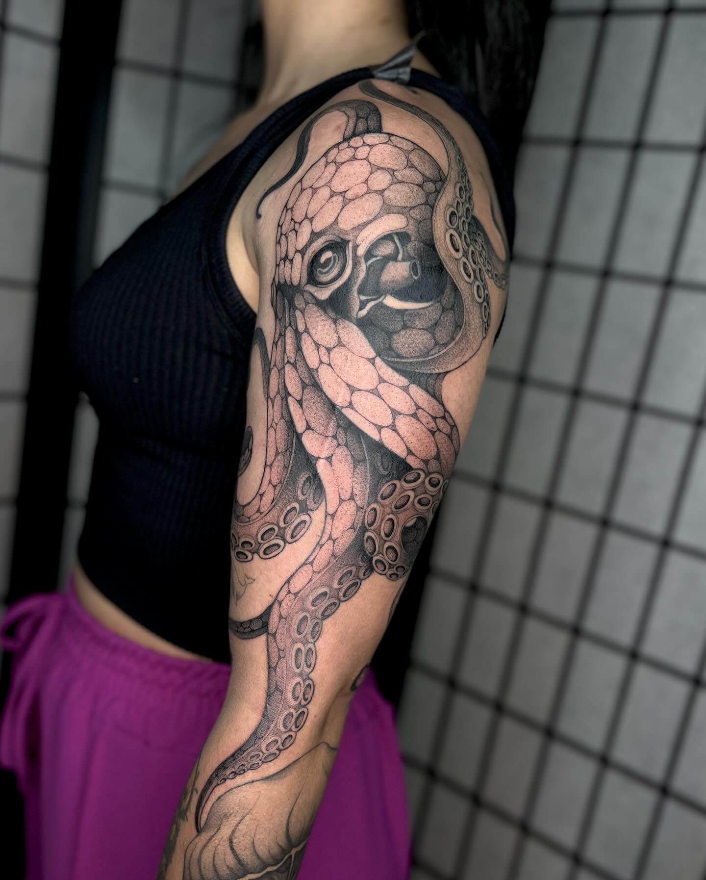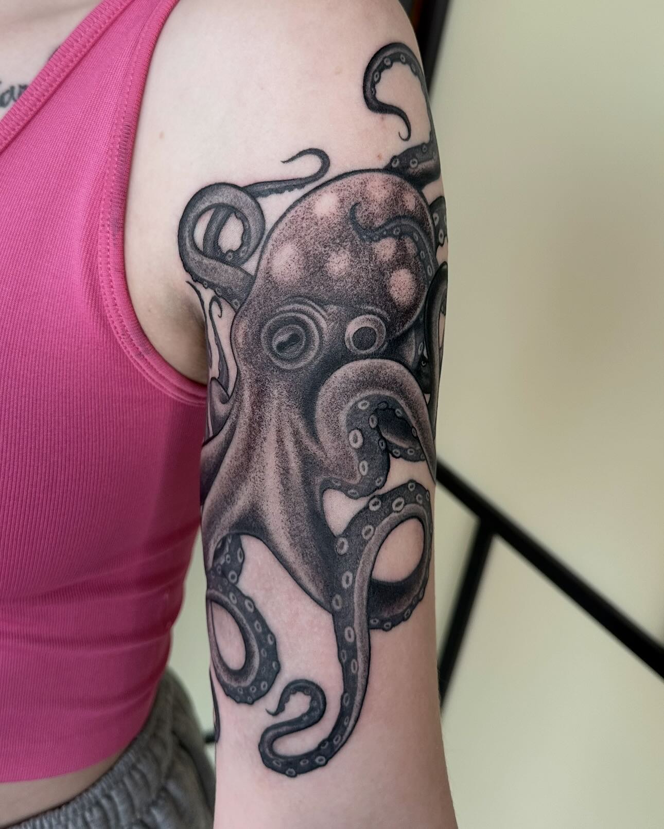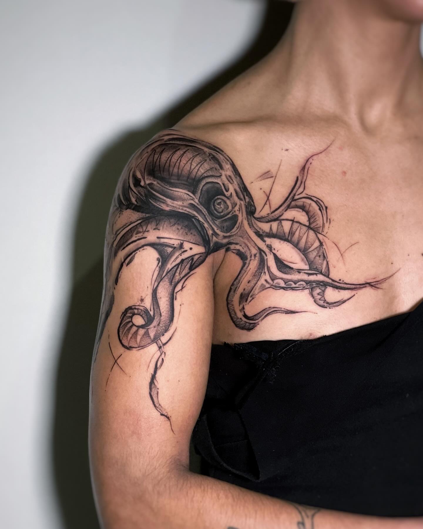 This striking octopus tattoo beautifully wraps around the shoulder, showcasing the intricate details of its tentacles. The blend of shading and line work creates a mesmerizing effect that draws the eye. For those considering something unique, opting for a design that flows with the body’s curves can enhance its overall impact.