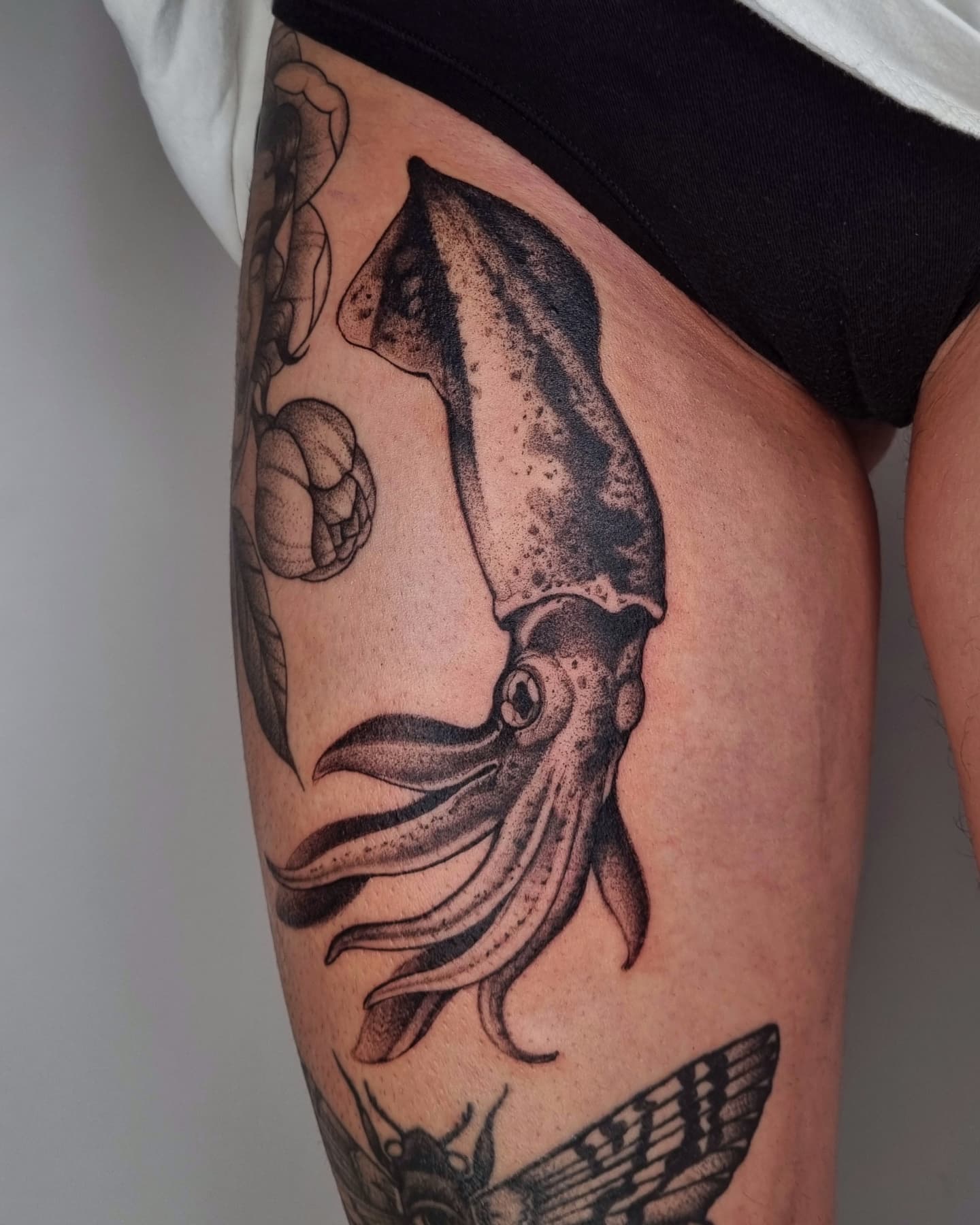 This stunning tattoo showcases a beautifully detailed squid, bringing a touch of ocean life to the skin. The intricate lines and shading create a lifelike effect that draws the eye and sparks curiosity. For those considering ocean-themed body art, this piece highlights the beauty of marine life and serves as a reminder of the wonders beneath the waves.