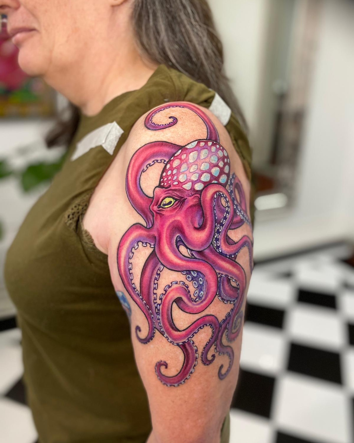 This stunning octopus tattoo features vibrant colors and intricate details that bring the creature to life. The bold pink tones and swirling tentacles create a dynamic visual that draws the eye, making it a perfect expression of individuality. For those considering their own ink, choosing a unique design like this can be a fantastic way to showcase personal style.