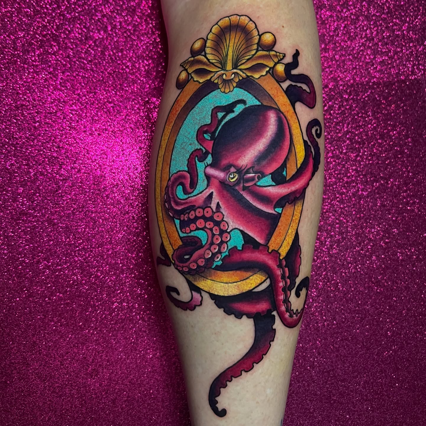 This tattoo showcases a vibrant octopus framed by an elegant shell, making it a true standout piece. The bold colors and detailed design bring the octopus to life, symbolizing intelligence and adaptability in a unique way. For those considering their next tattoo, choosing a design that reflects personal meaning can make it even more special.