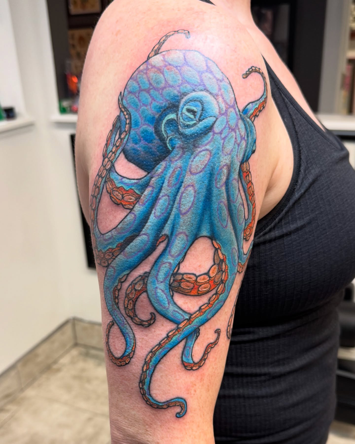 This stunning octopus tattoo combines vibrant blues and rich reds, making it a true work of art. The intricate details of the octopus’s tentacles and body showcase the skill of the tattoo artist, creating a design that celebrates the beauty of marine life. For those considering an octopus tattoo, think about how the colors and style reflect your personality and connection to the ocean.
