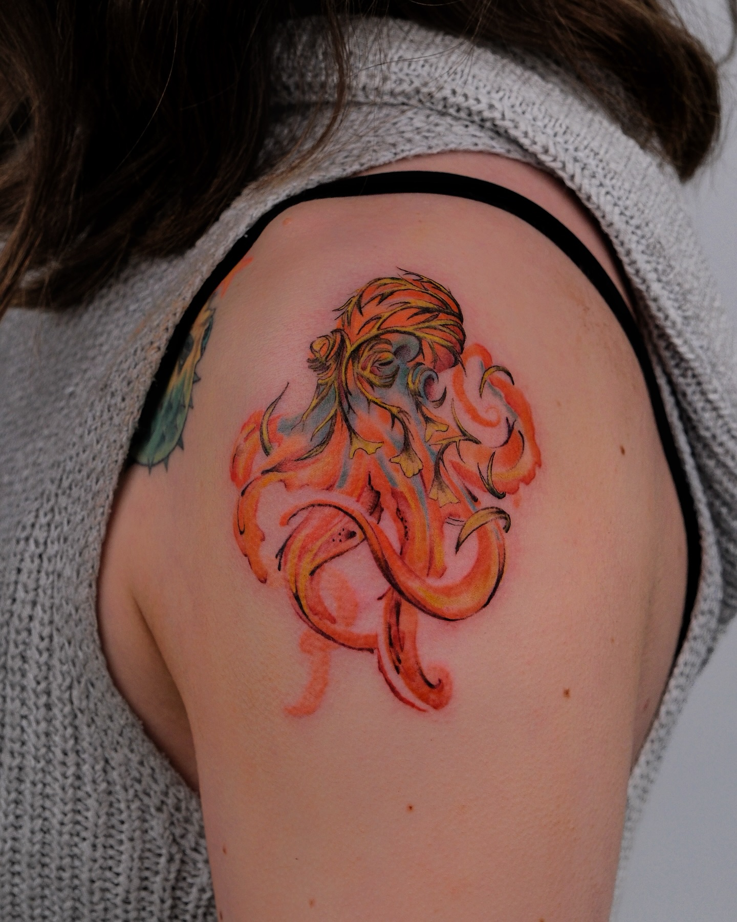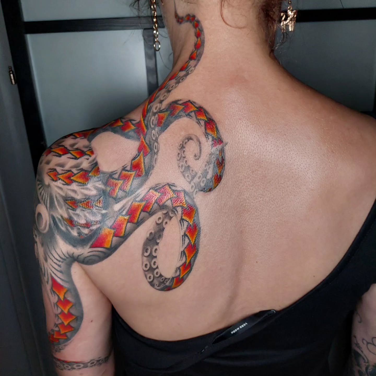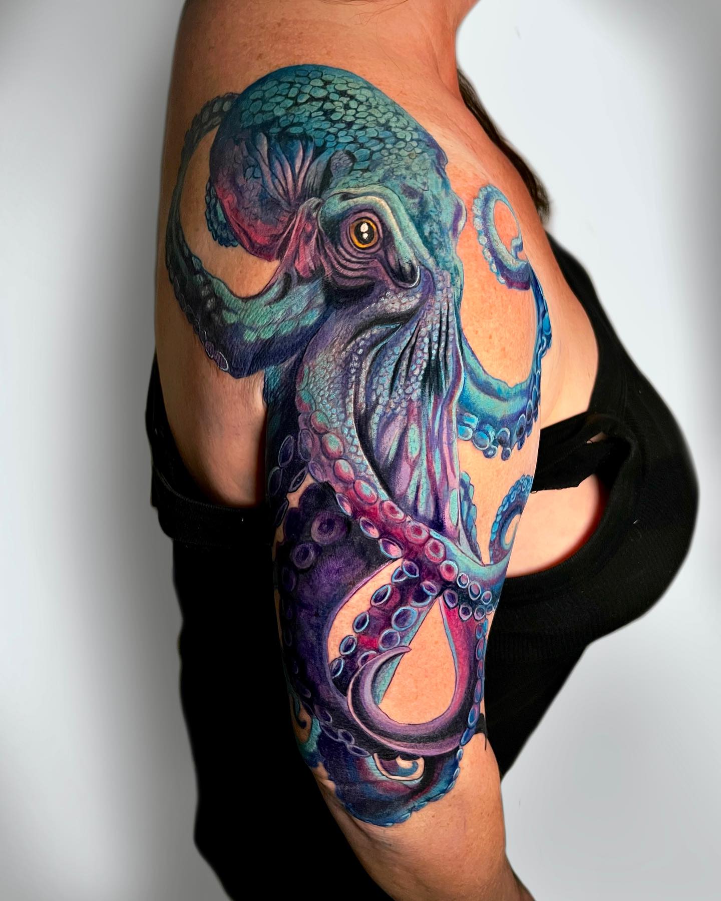 This tattoo showcases a beautifully detailed octopus winding gracefully across the shoulder, its vibrant colors making it truly stand out. The intricate design mixes bold hues with delicate lines, creating an eye-catching piece that tells a story of strength and creativity. For those considering octopus tattoos, choosing bright colors can elevate the artwork even further, making it a memorable expression of individuality.