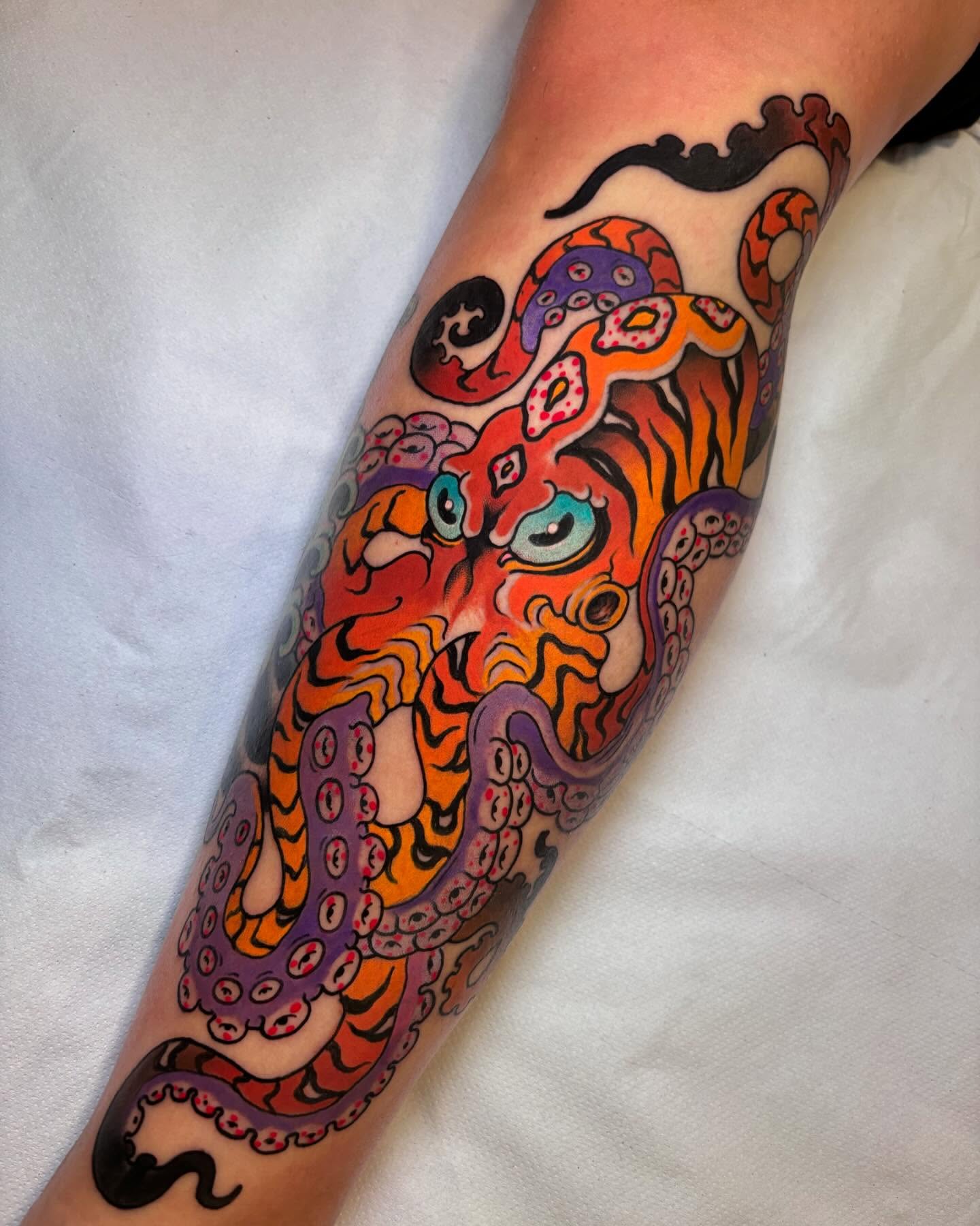 This tattoo showcases a vibrant octopus with intricate details and bold colors that truly stand out. The fluid lines and playful swirls of the tentacles create a sense of movement and life, making it a remarkable choice for anyone looking to express their unique personality. For those considering a similar design, choosing bright colors can add an extra touch of flair and make the artwork pop even more.