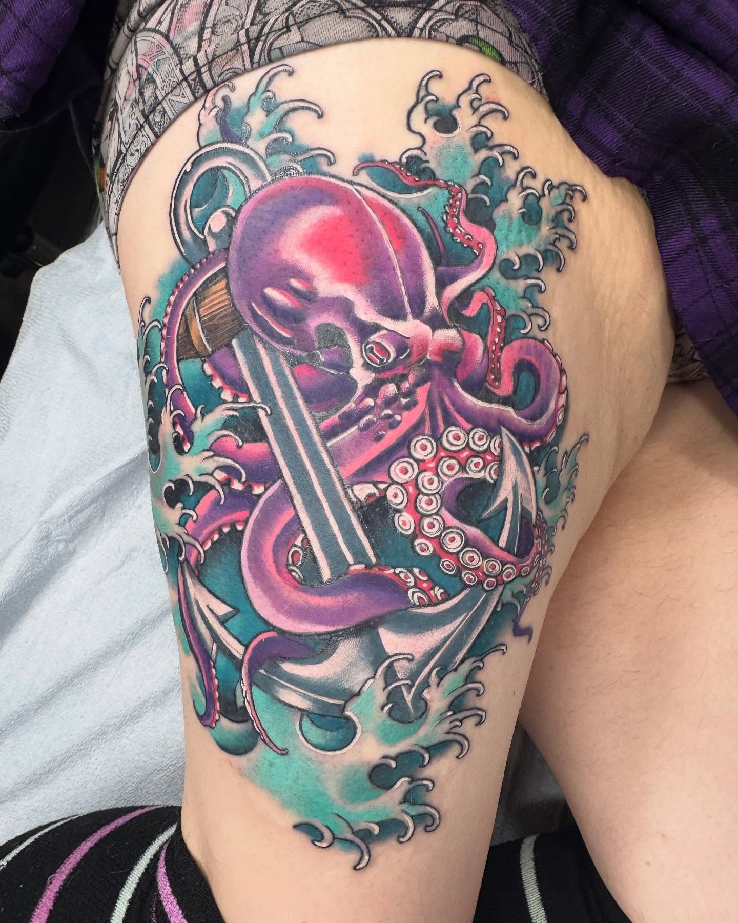 This stunning tattoo features a vibrant octopus intertwined with waves and an anchor, creating a dynamic underwater scene. The rich colors and intricate details bring the artwork to life, making it truly eye-catching. For those considering octopus tattoos, choosing colors that resonate with personal experiences can make the design even more meaningful.