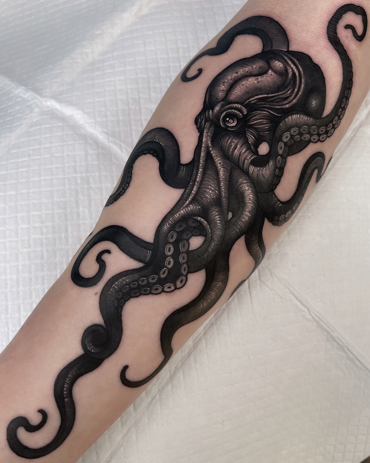 This tattoo showcases an intricately detailed octopus, its tentacles gracefully swirling around, creating a mesmerizing effect. The artistic style captures the creature’s unique form, making it not just a tattoo but a statement piece. For those considering an octopus tattoo, choosing a design that reflects personal meaning can make it even more special.