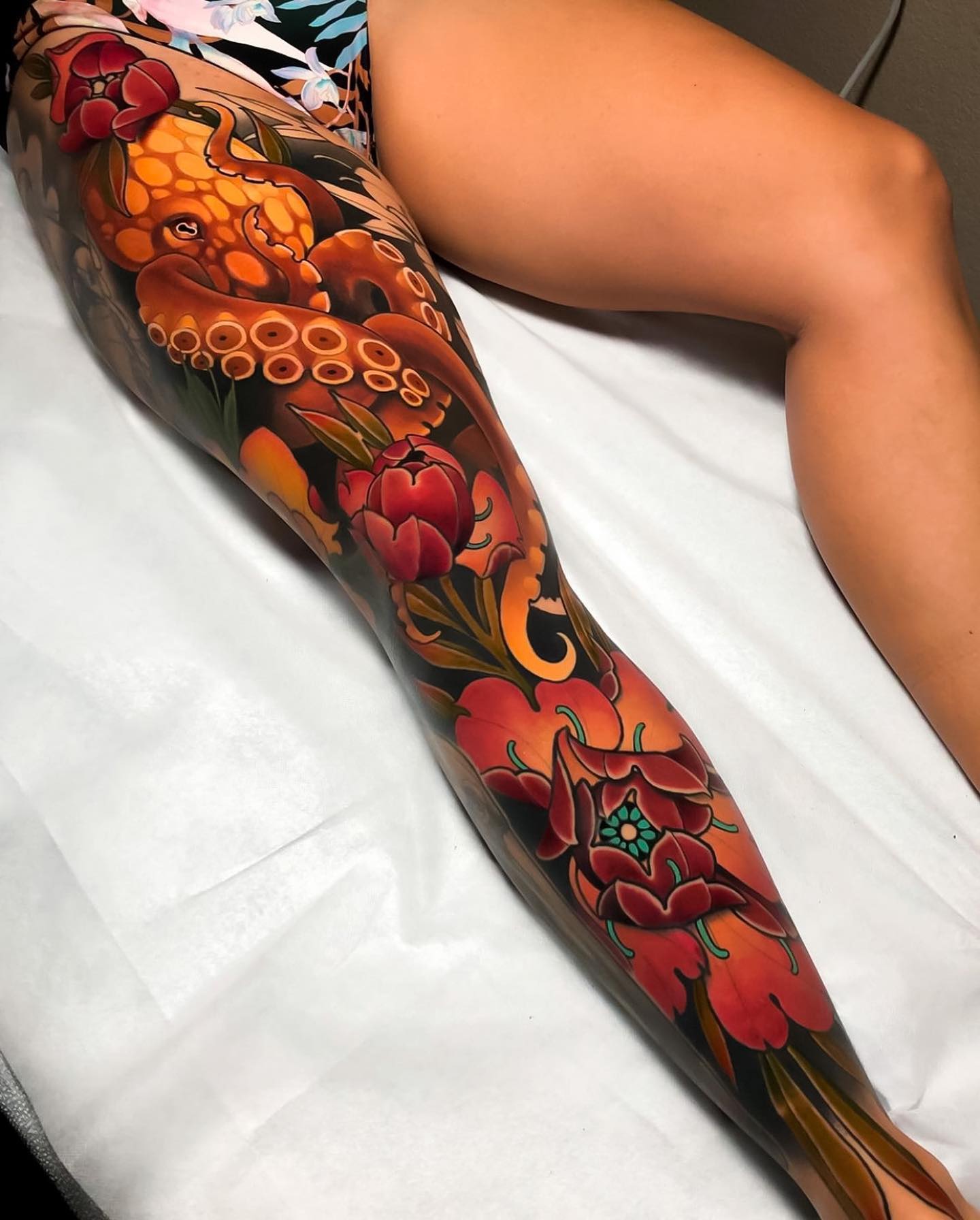 This tattoo beautifully blends vibrant colors and intricate designs, showcasing a stunning octopus entwined with blooming flowers. The unique combination of marine life and botanical elements creates a striking visual that tells a story of strength and grace. For anyone considering a similar design, choosing bold colors can make the artwork truly stand out.