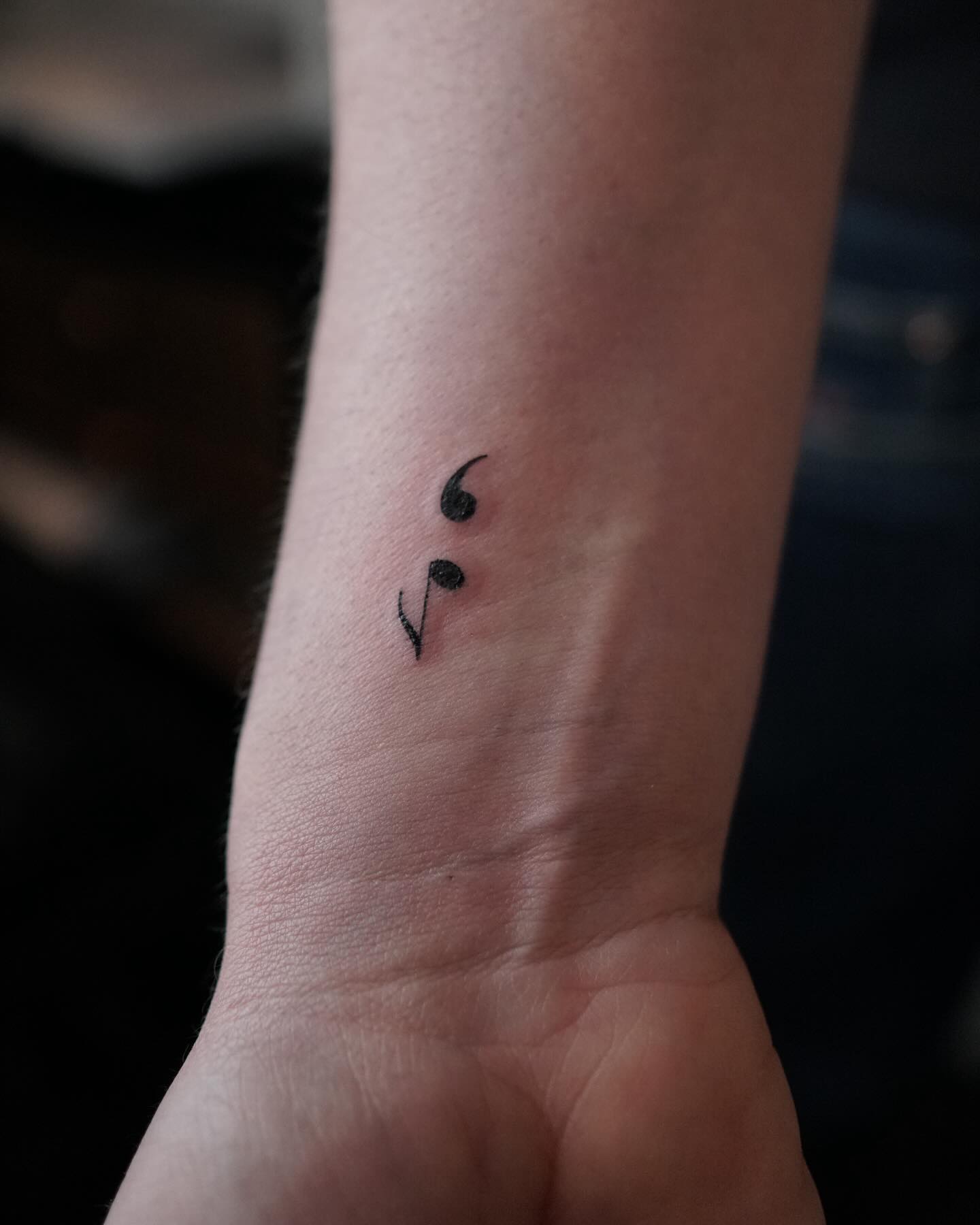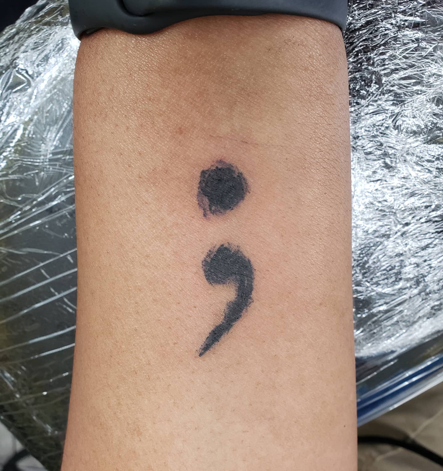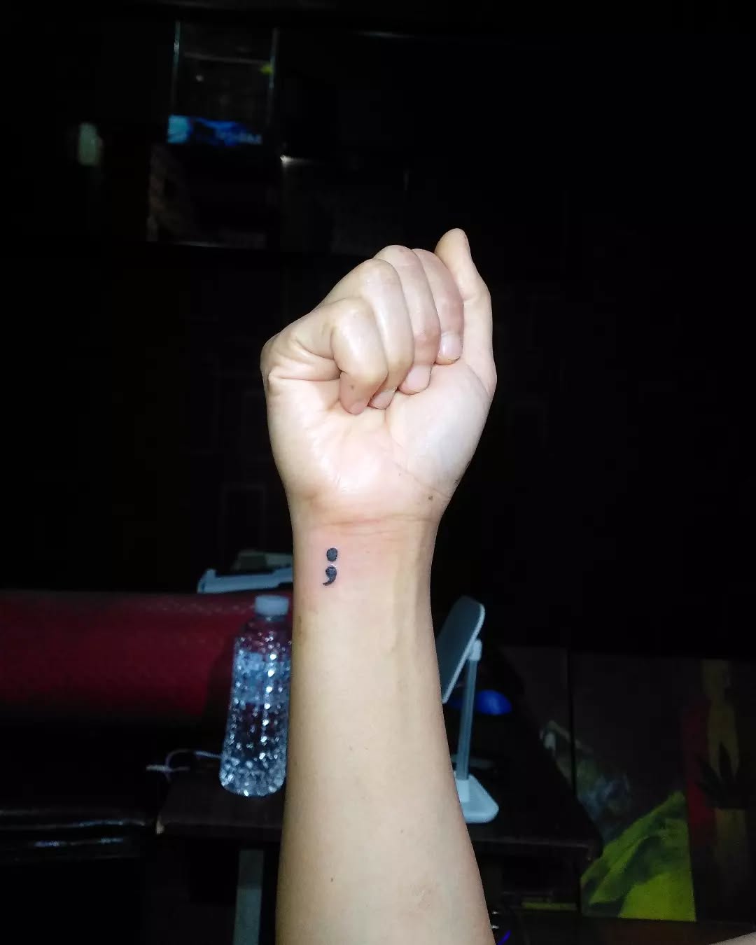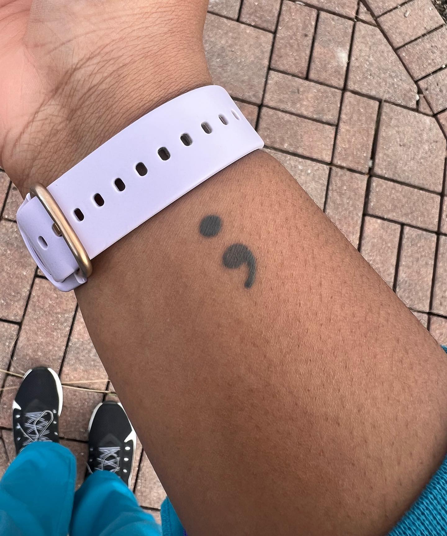A clean black semicolon tattoo is prominently displayed on the person’s forearm, accompanied by a small dot above it.