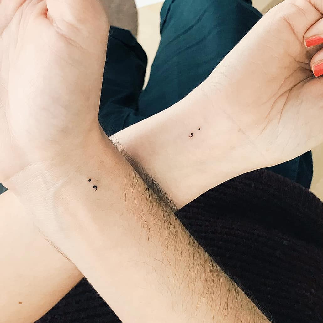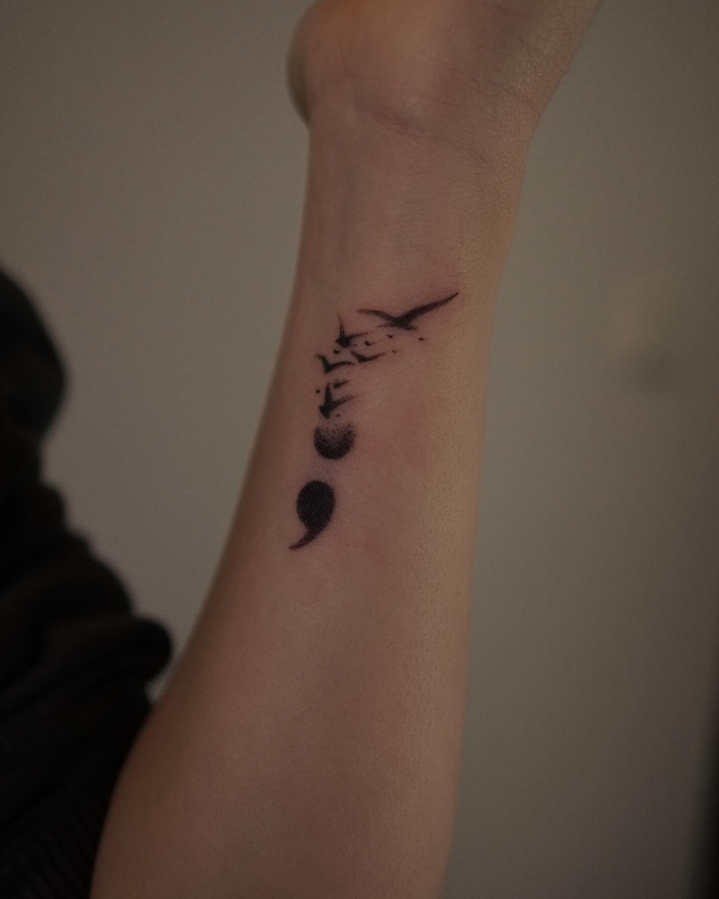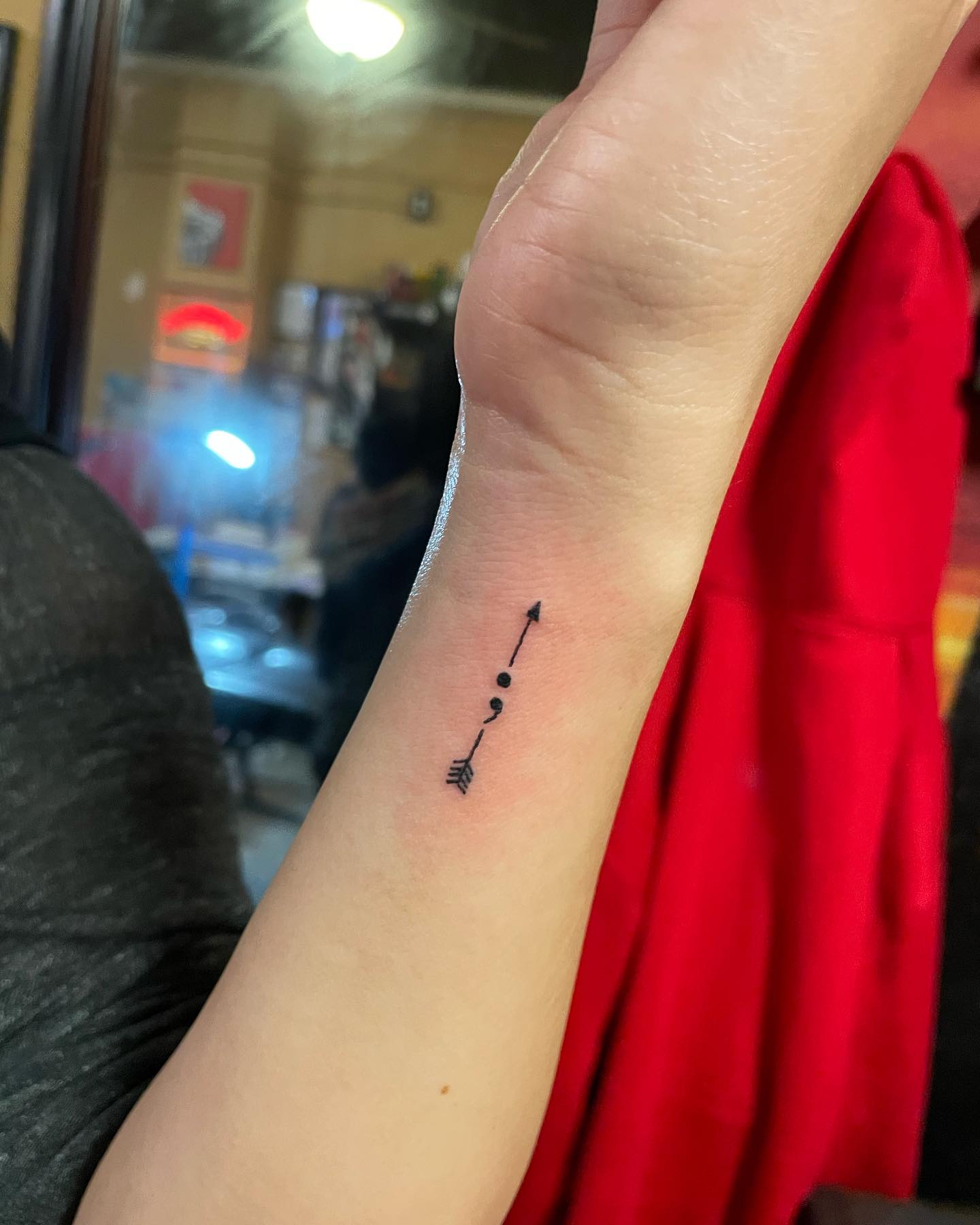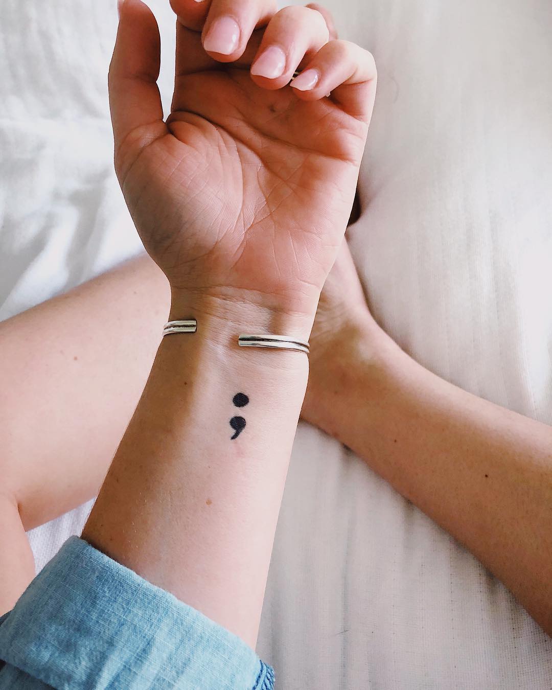 A clean black semicolon tattoo is prominently displayed on the person’s forearm, accompanied by a small dot above it.