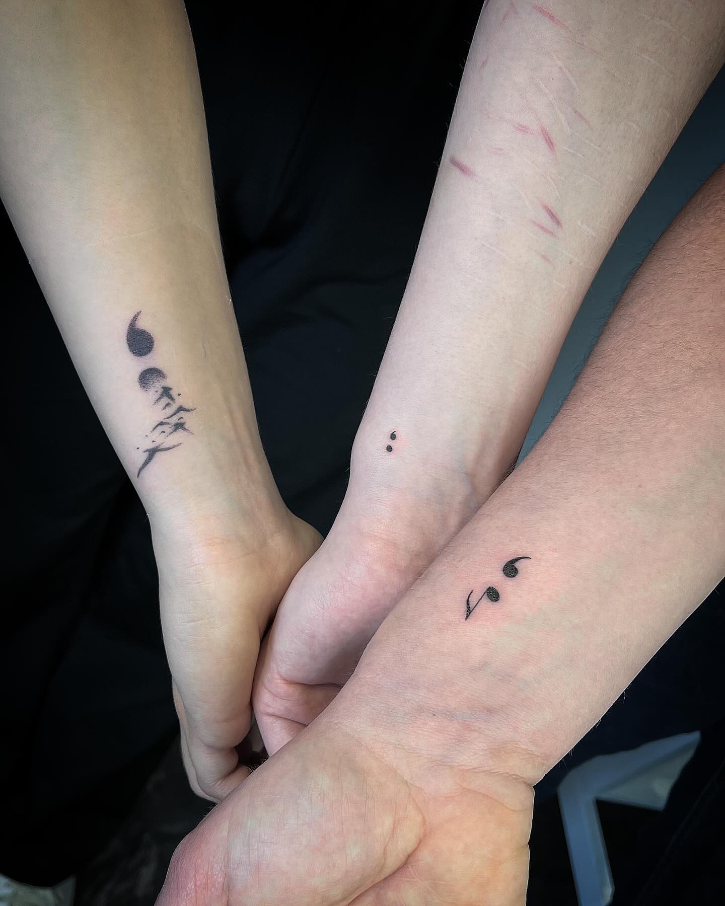 The linework is clean and simple, creating a striking contrast against the skin, while the semicolon at the bottom connects the designs, symbolizing continuity and resilience.