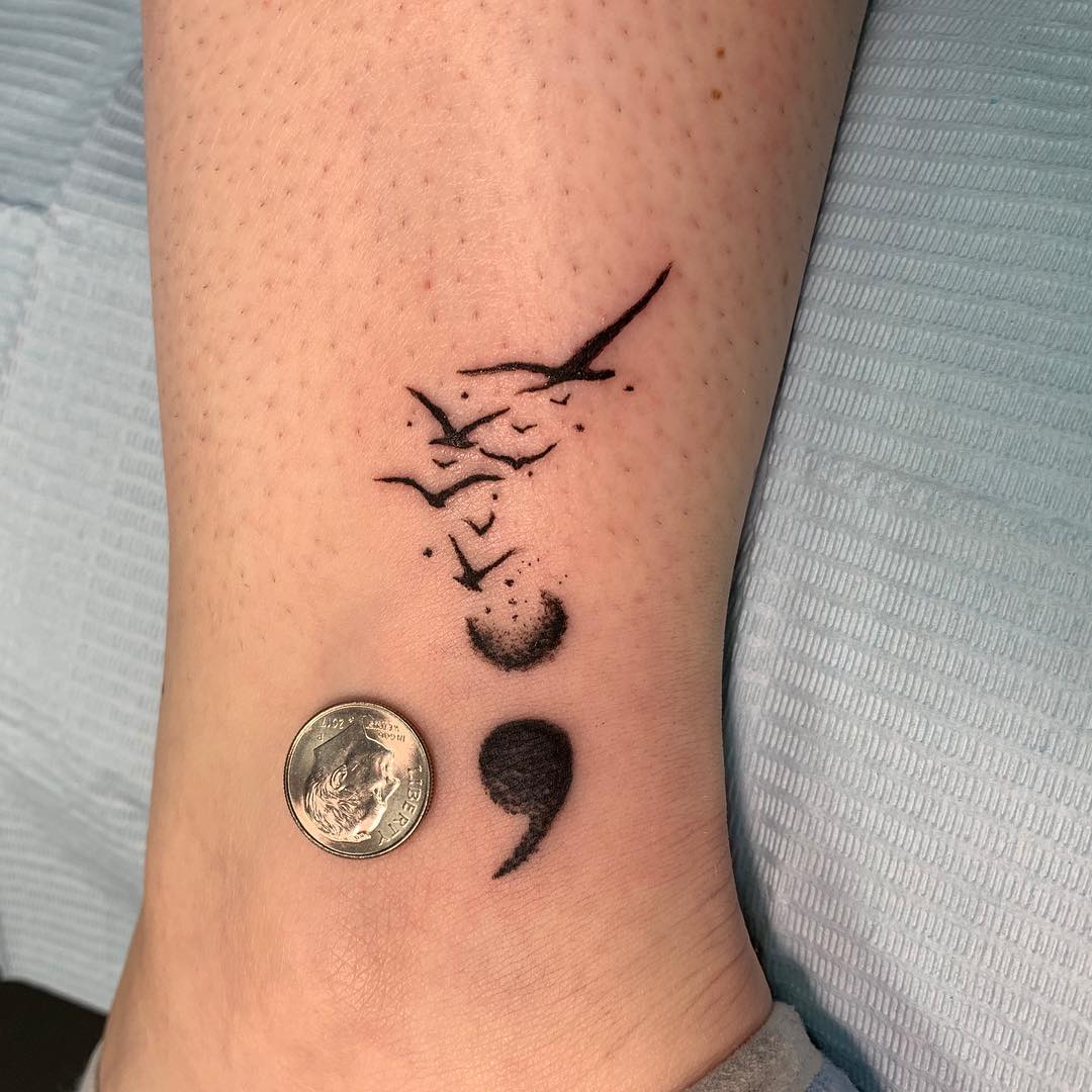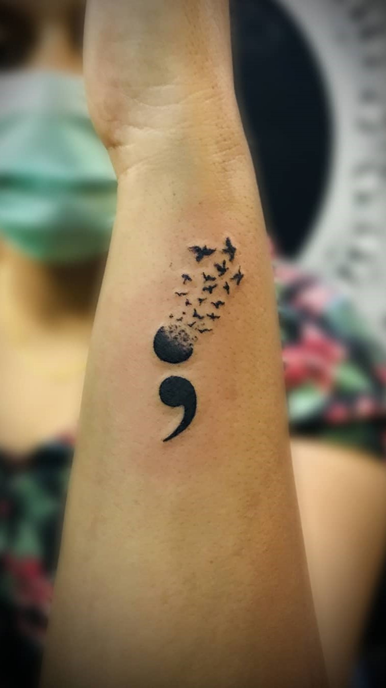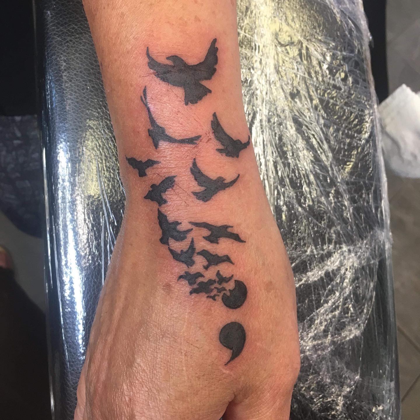 The tattoo features a prominent semicolon at its base, symbolizing hope and continuation, from which a cloud of birds appears to be taking flight.