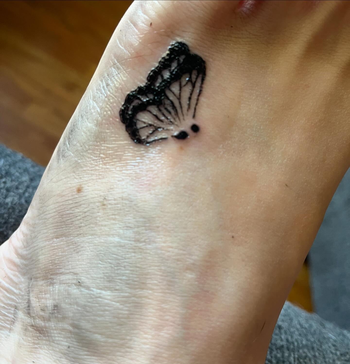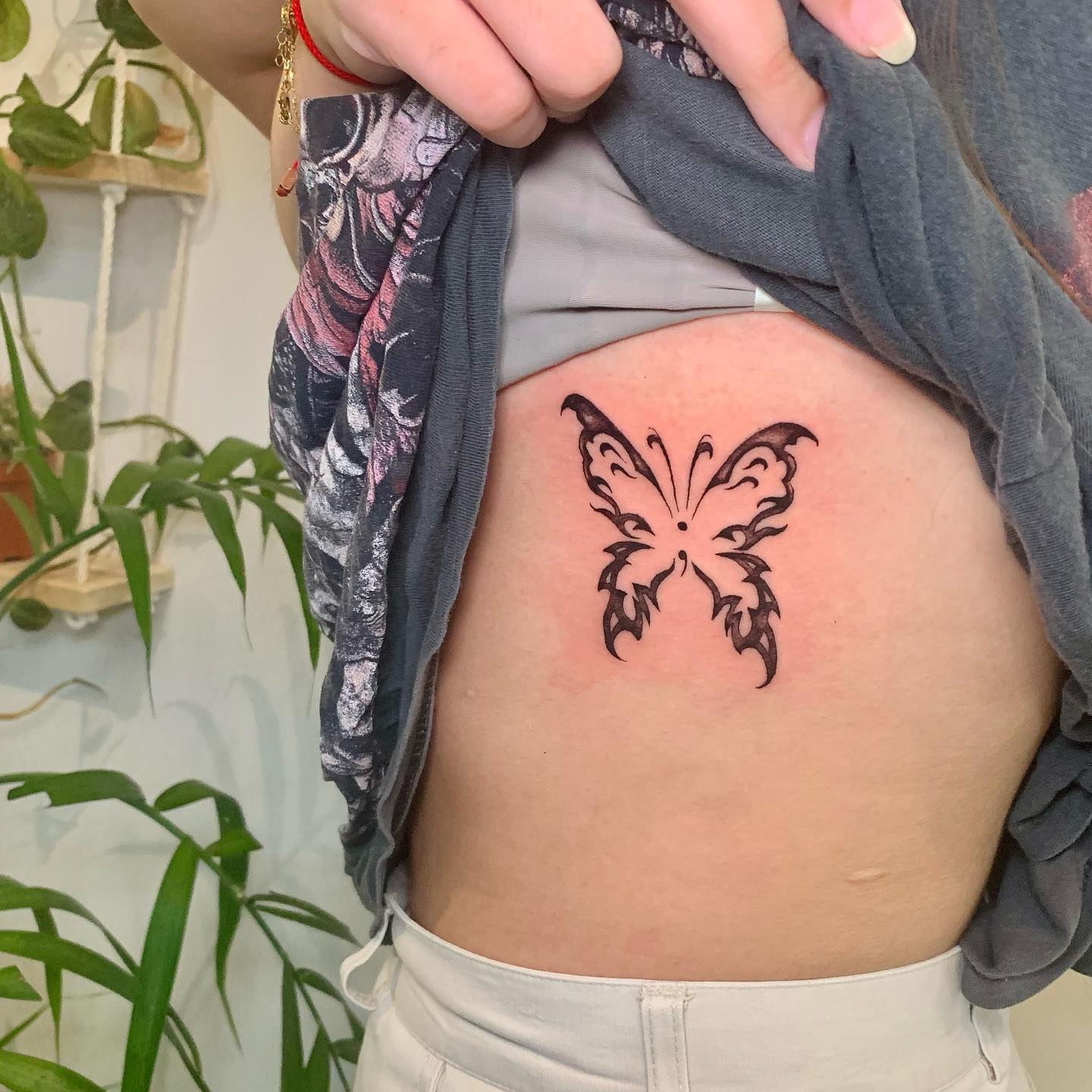 The tattoo features a butterfly design characterized by its detailed wings and graceful curves.