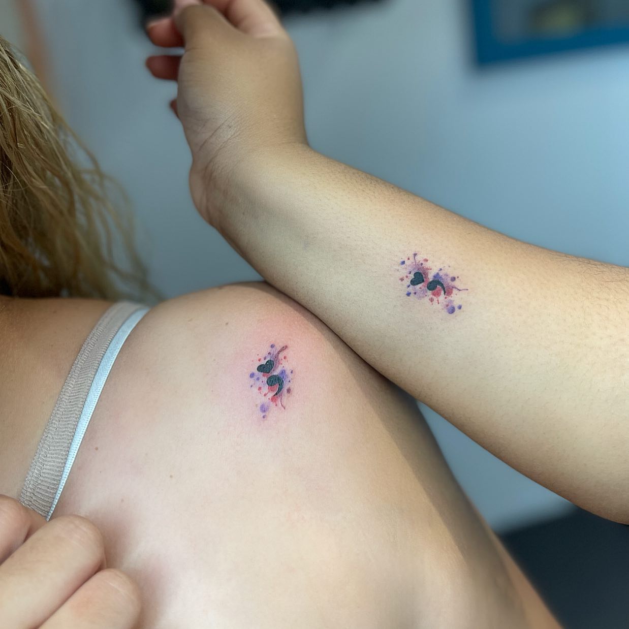 The semicolon tattoos are adorned with vibrant splashes of color, creating a lively effect around the symbols.