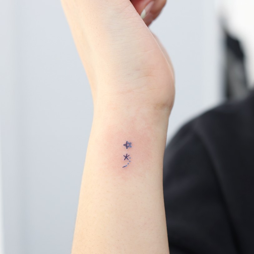 Each tattoo is precisely inked in black, with clean lines that highlight their simplicity and significance.