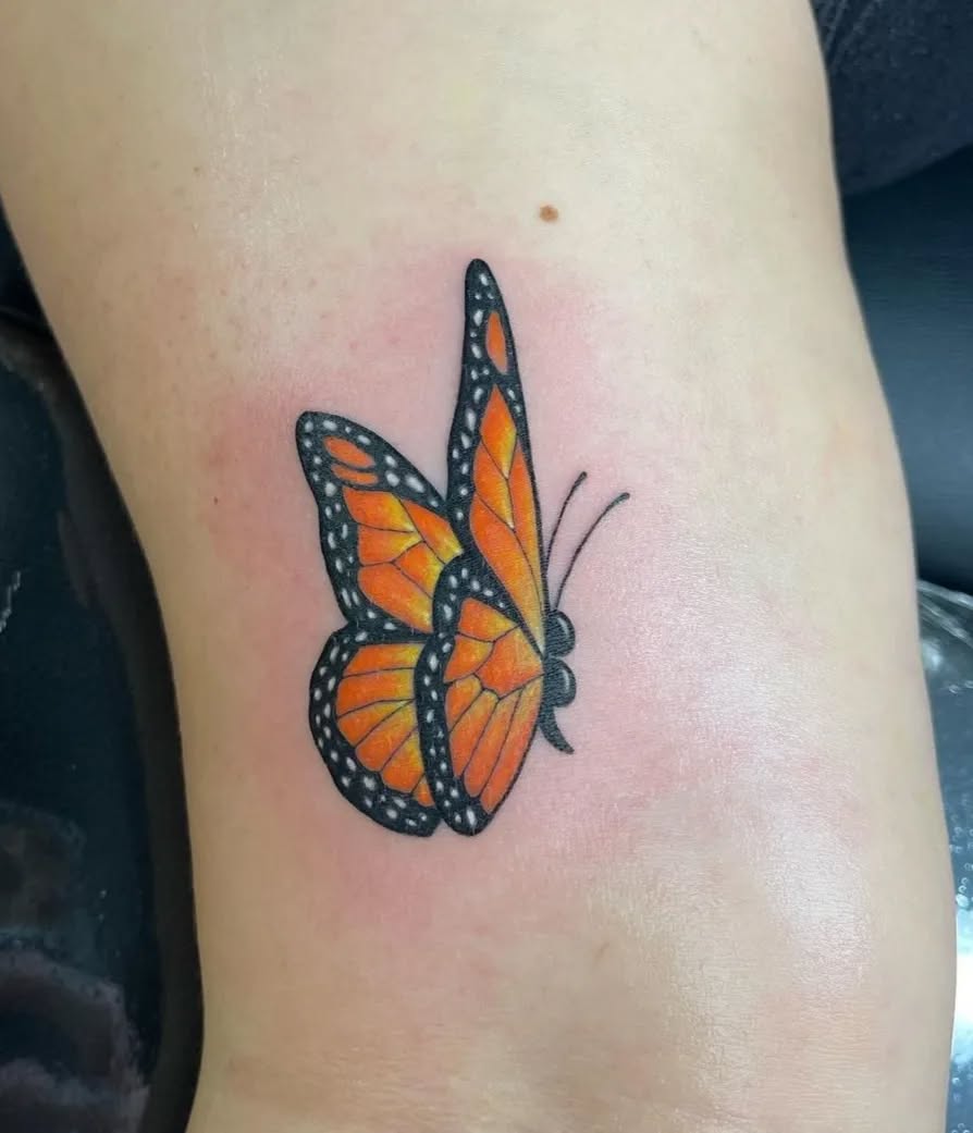 The tattoo features a detailed monarch butterfly with bright orange and black patterns.