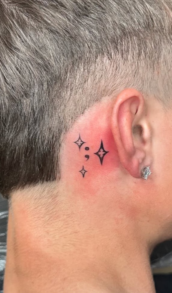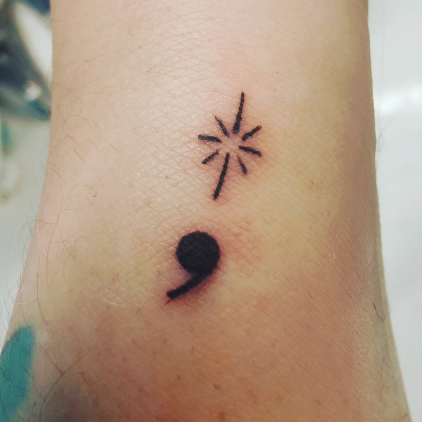 The tattoo features a semicolon surrounded by small star-like sparkles, creating a unique visual statement.