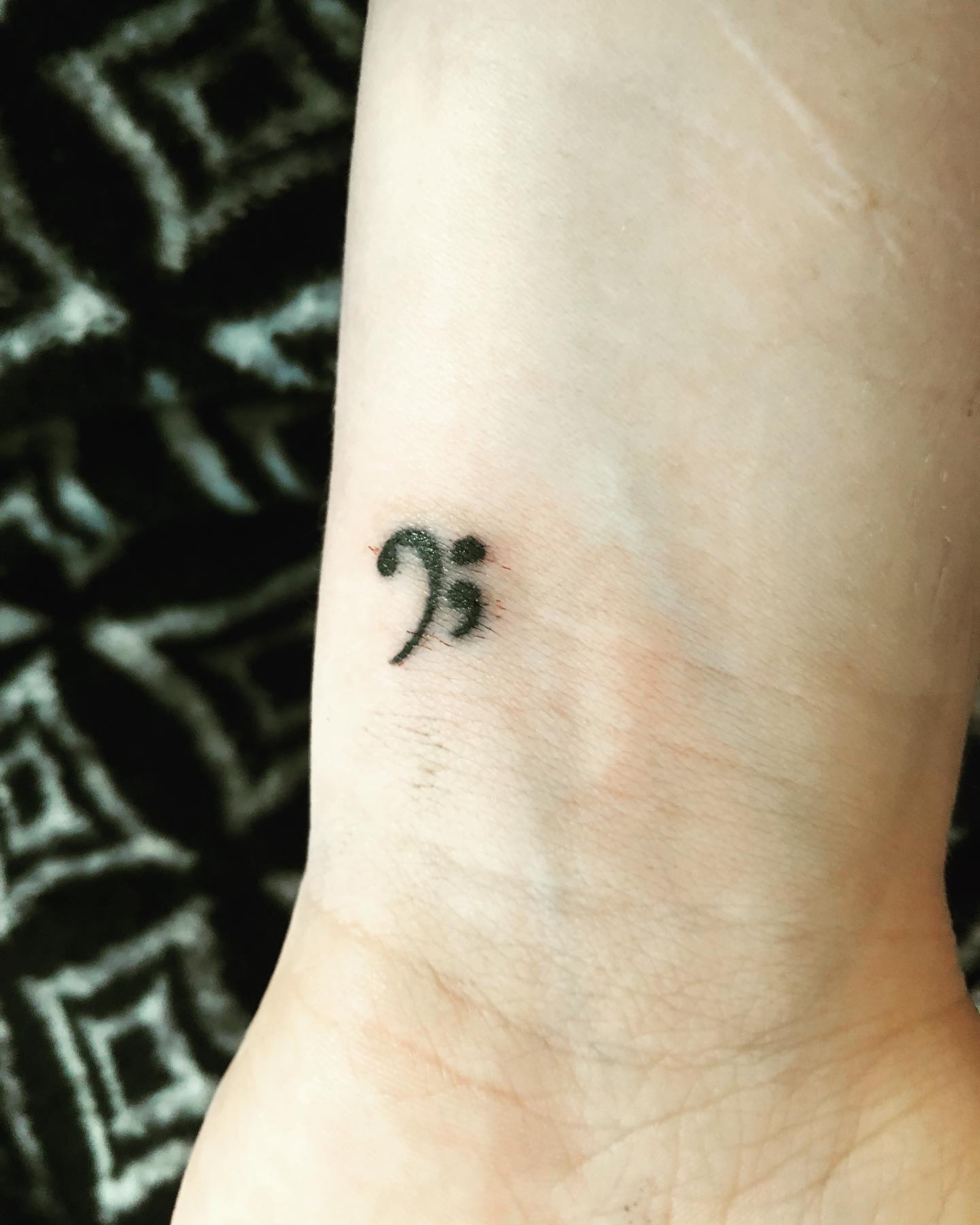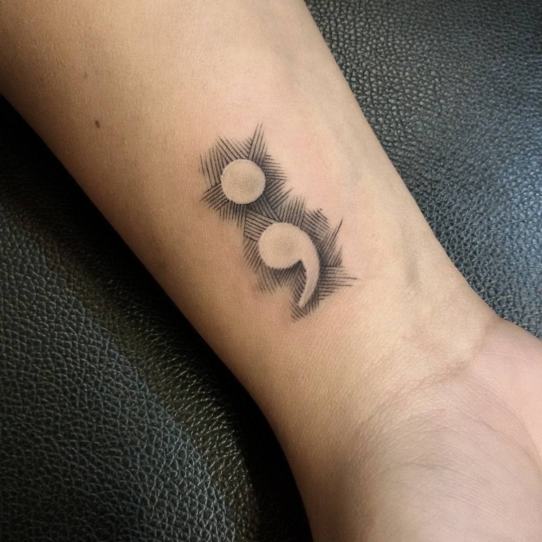 The tattoo features a simple semicolon design, prominently displayed on the wrist.