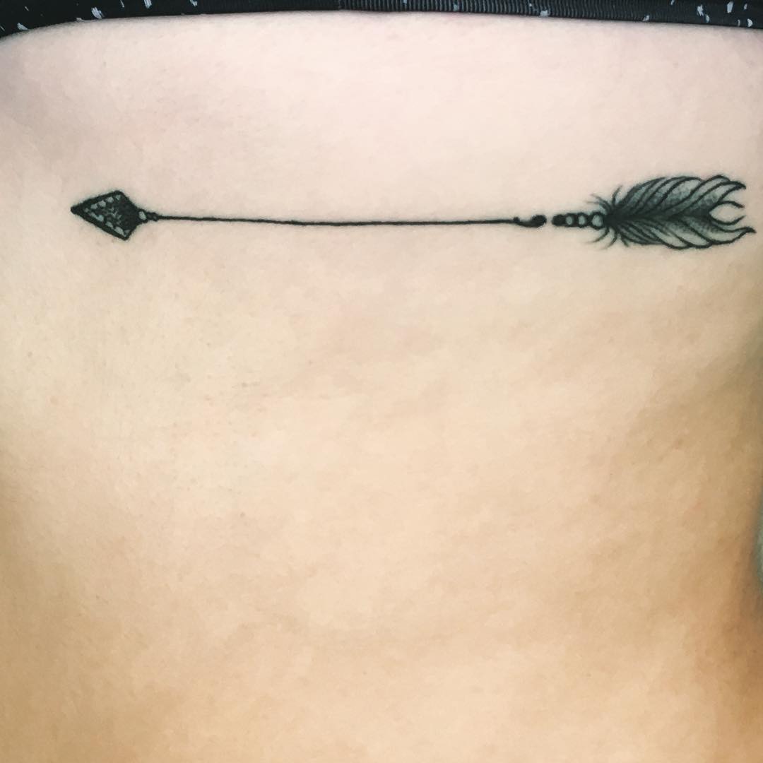 The tattoo features a sleek arrow with a finely detailed feather at the end, showcasing a minimalist yet striking design.