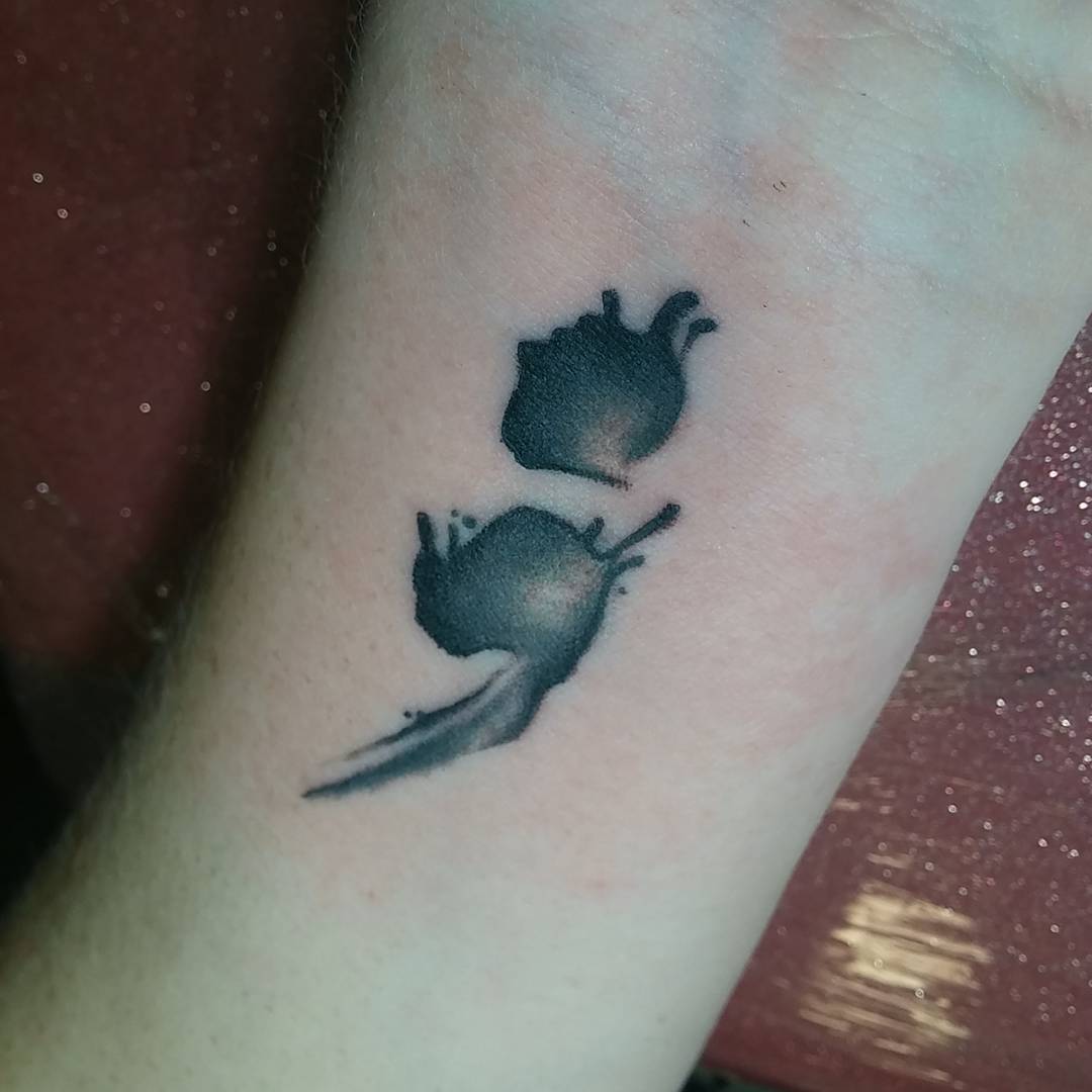 The tattoo features a semicolon formed from ink splashes, giving it a dynamic and artistic look.