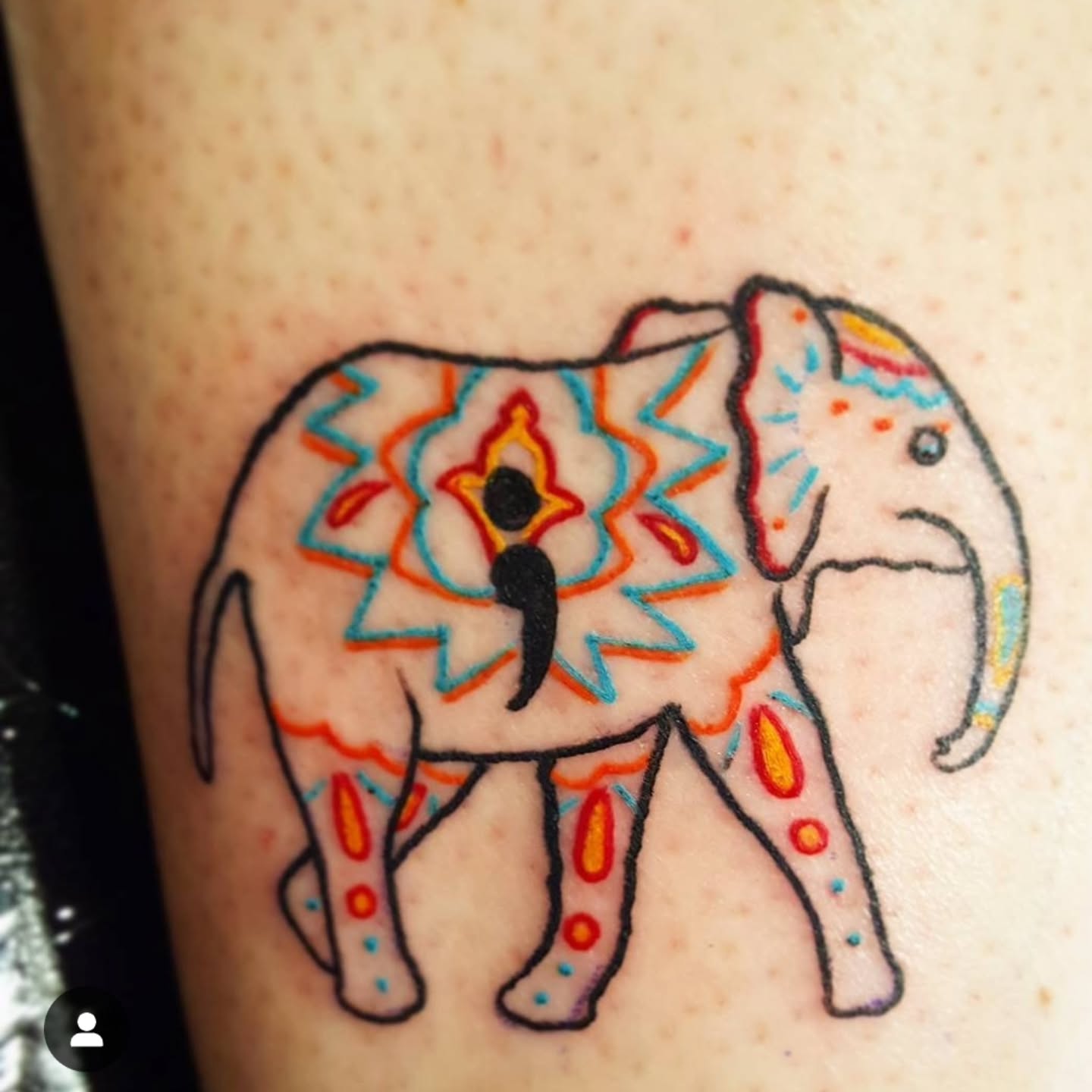 The tattoo features a vibrant elephant adorned with intricate patterns and a prominent semicolon integrated into its design.