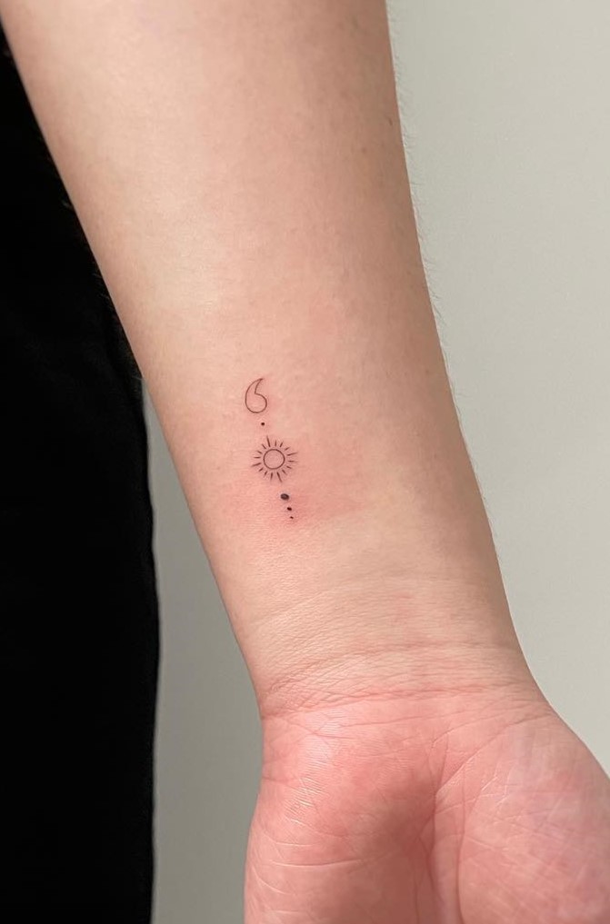 The tattoo features a semicolon alongside a sun, creating a meaningful connection between light and resilience.