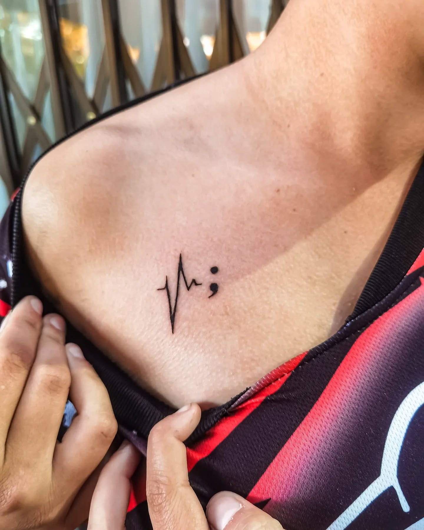 The tattoo features a heartbeat line that transitions into a semicolon, symbolizing the connection between life and resilience.