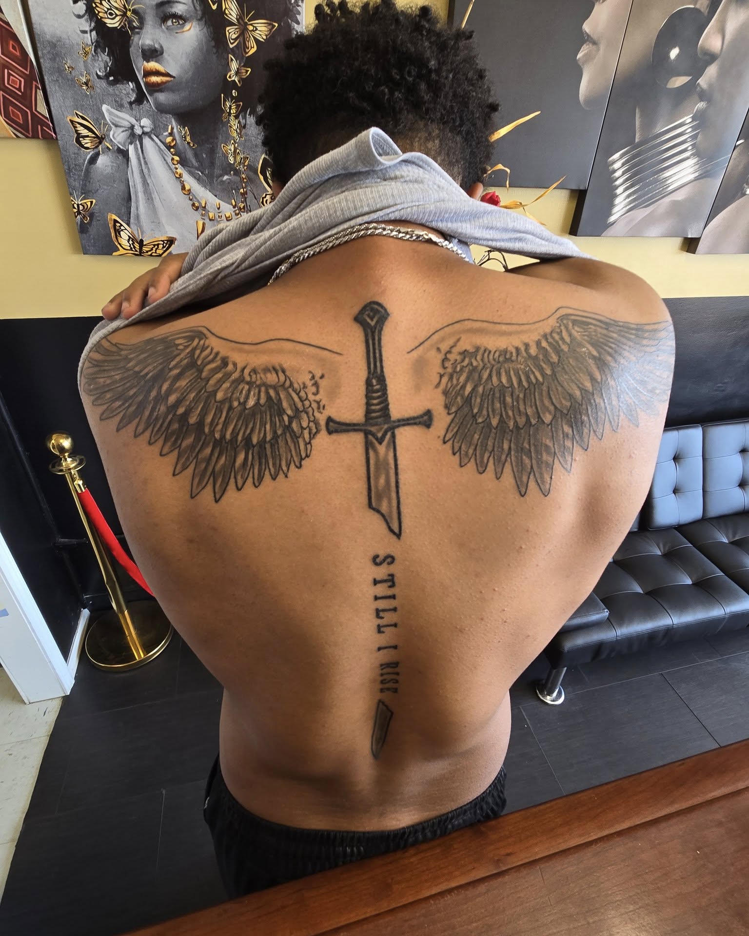 The tattoo features a centrally placed sword flanked by large, detailed wings that spread across the upper back.