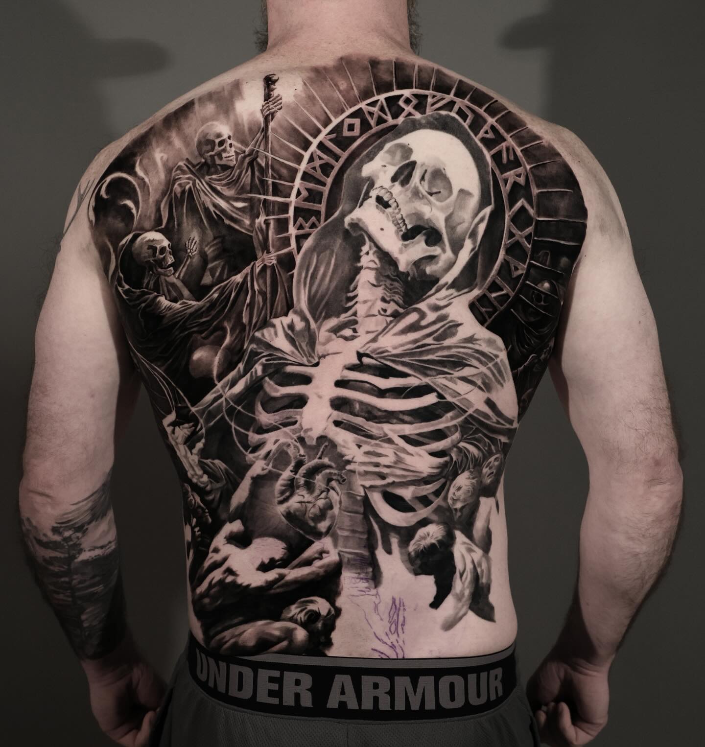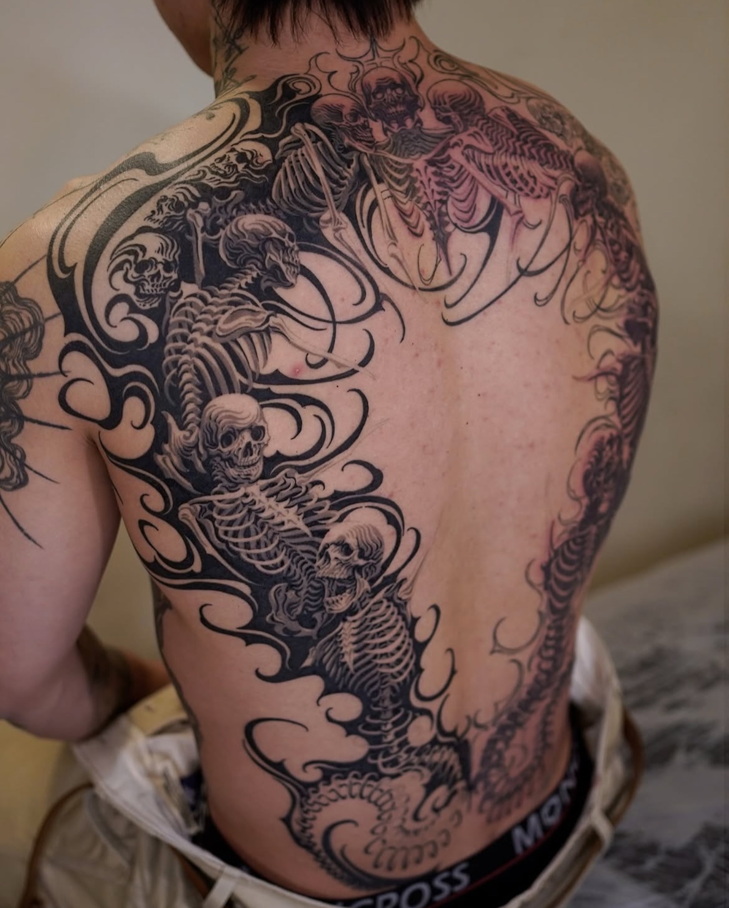 The back tattoo features a striking arrangement of skeletons intertwined with human figures, creating a dramatic and intricate design.