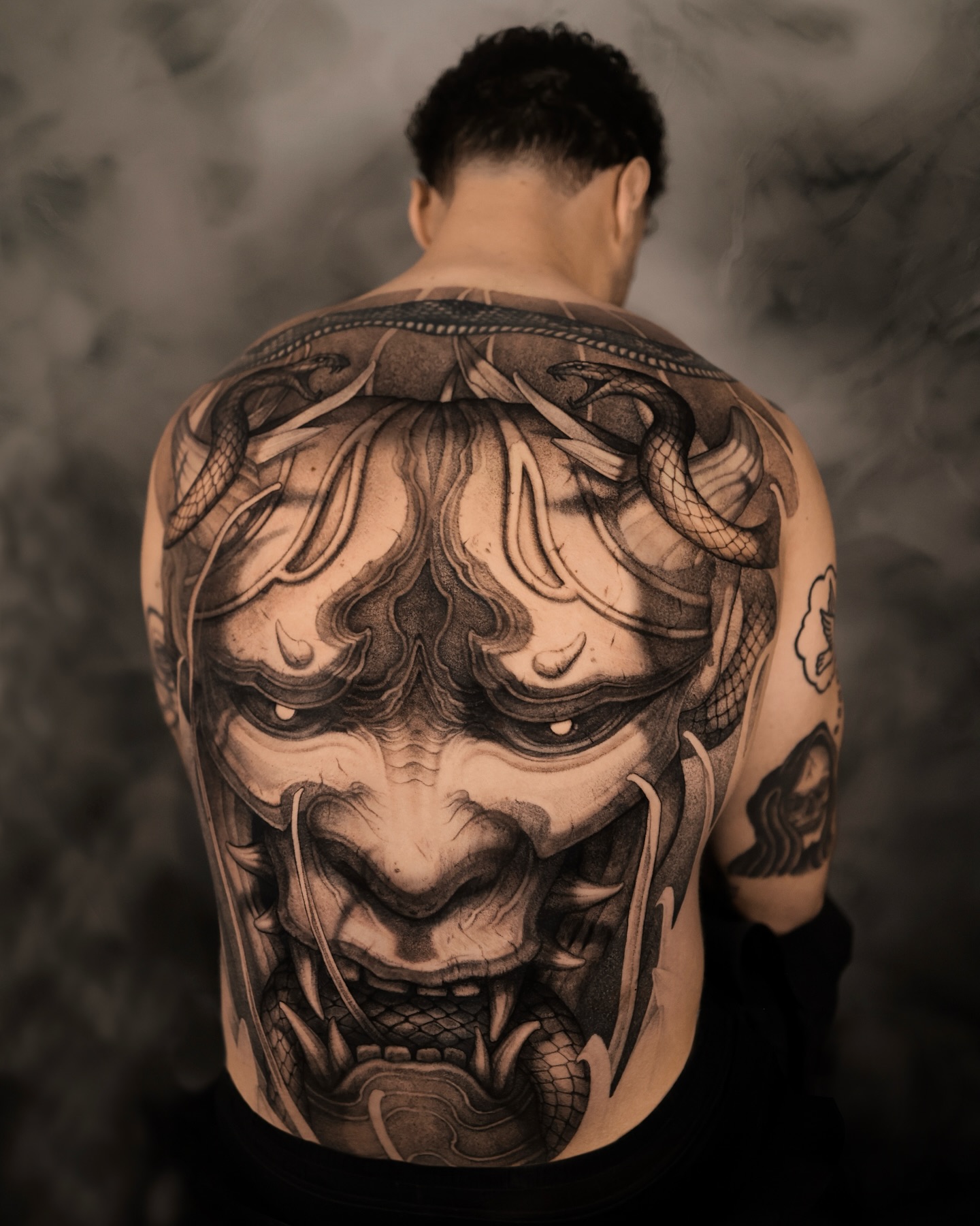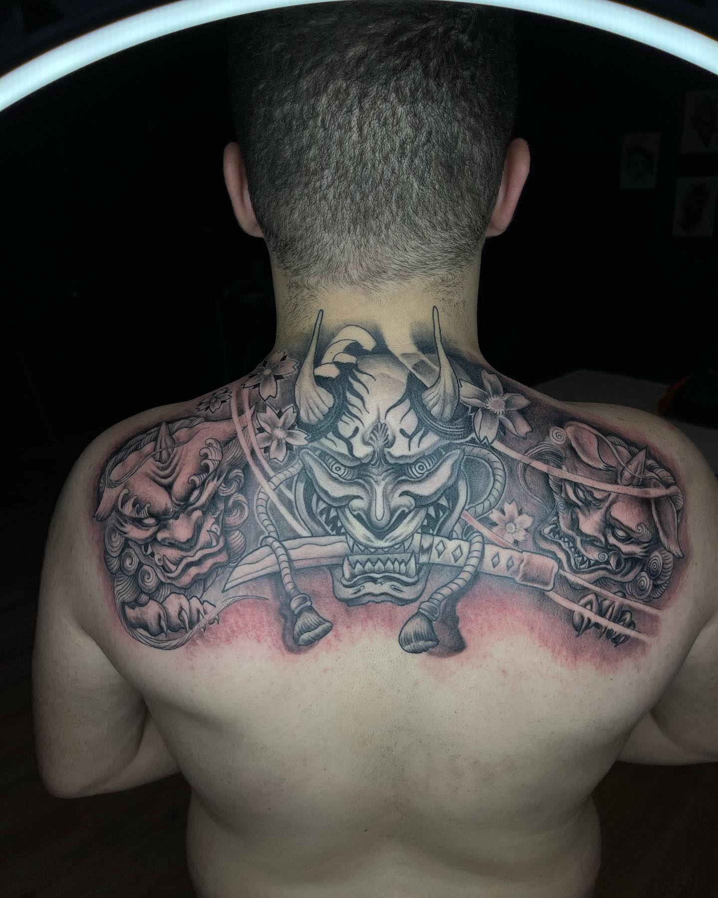 The back tattoo features intricate samurai masks surrounded by delicate floral patterns.