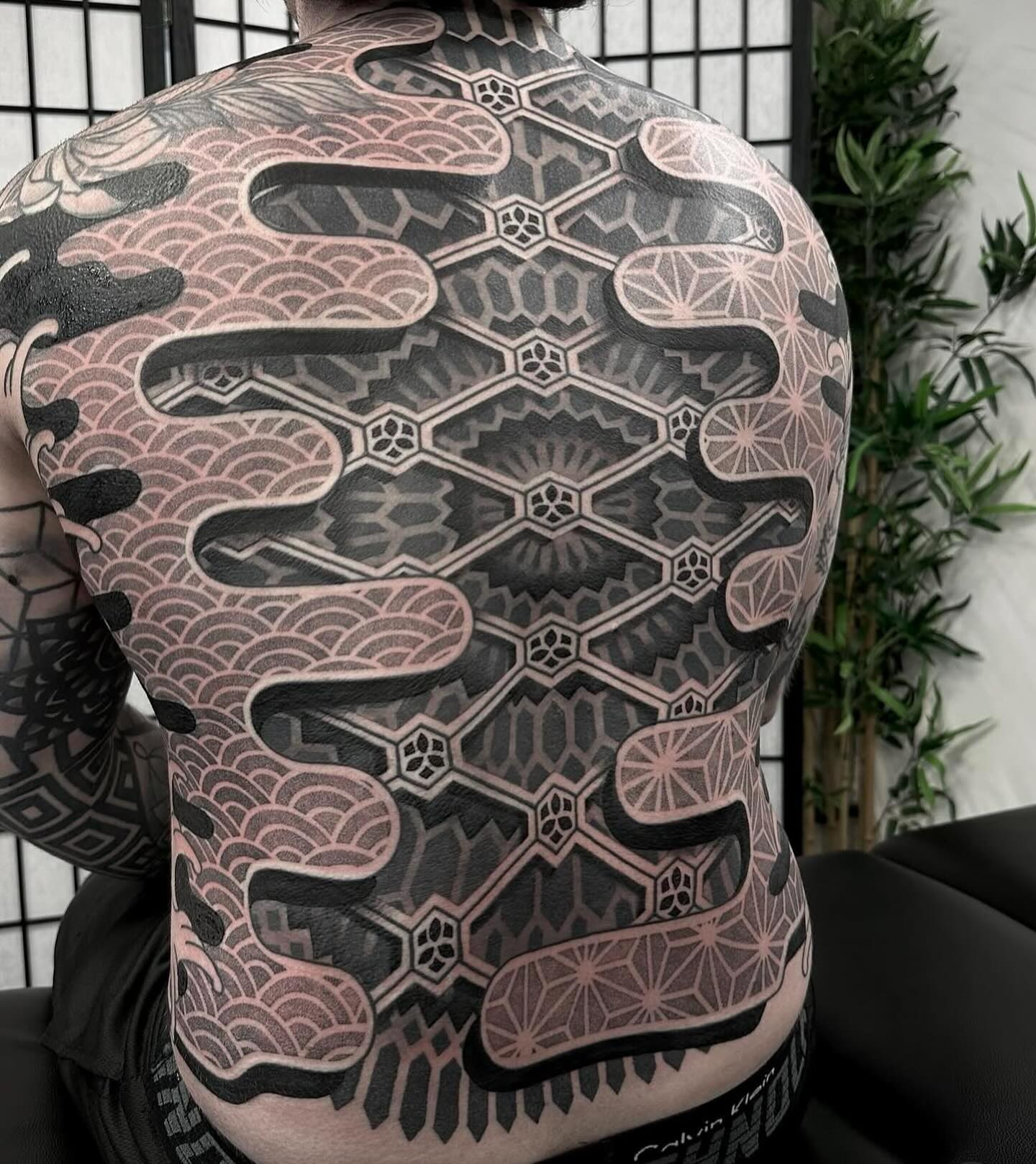 The tattoo showcases a blend of geometric shapes and flowing lines that create a striking visual effect across the back.