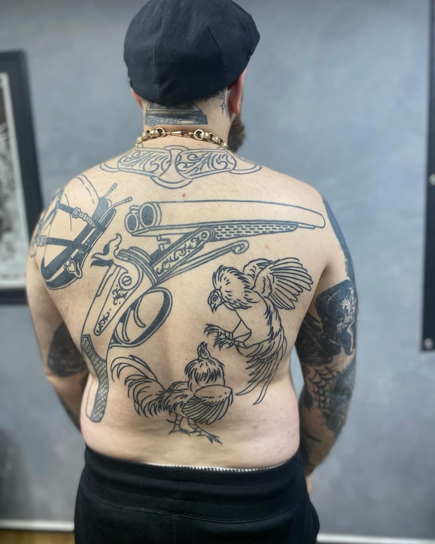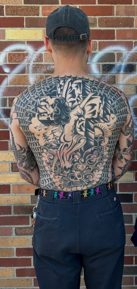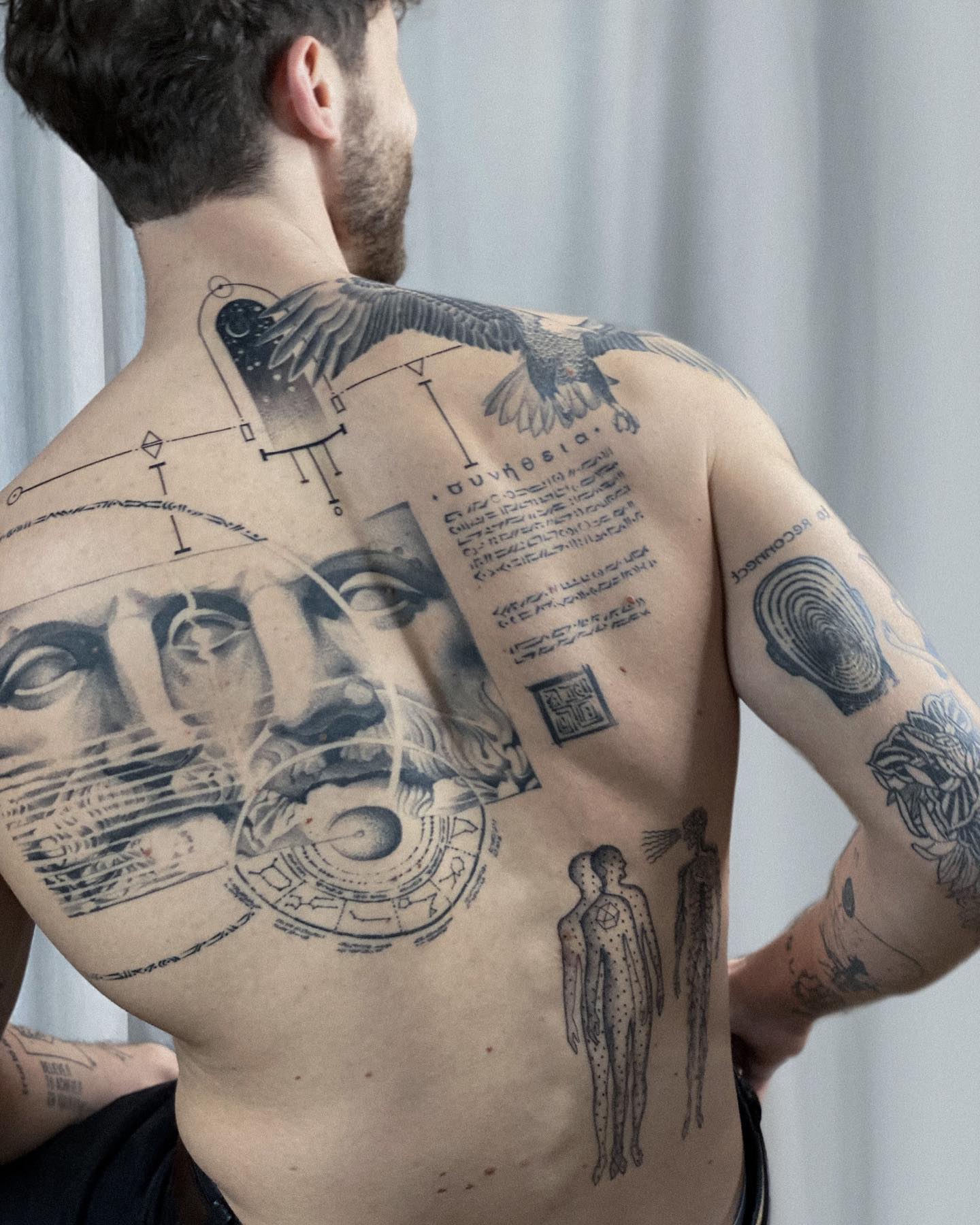 The back tattoo features a vibrant collage of various characters and scenes, creating a striking visual story.