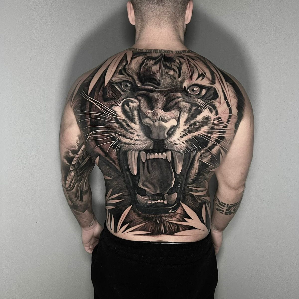 This artwork combines realistic details with dramatic contrasts, using techniques like shading and line work to create depth and movement across the back.