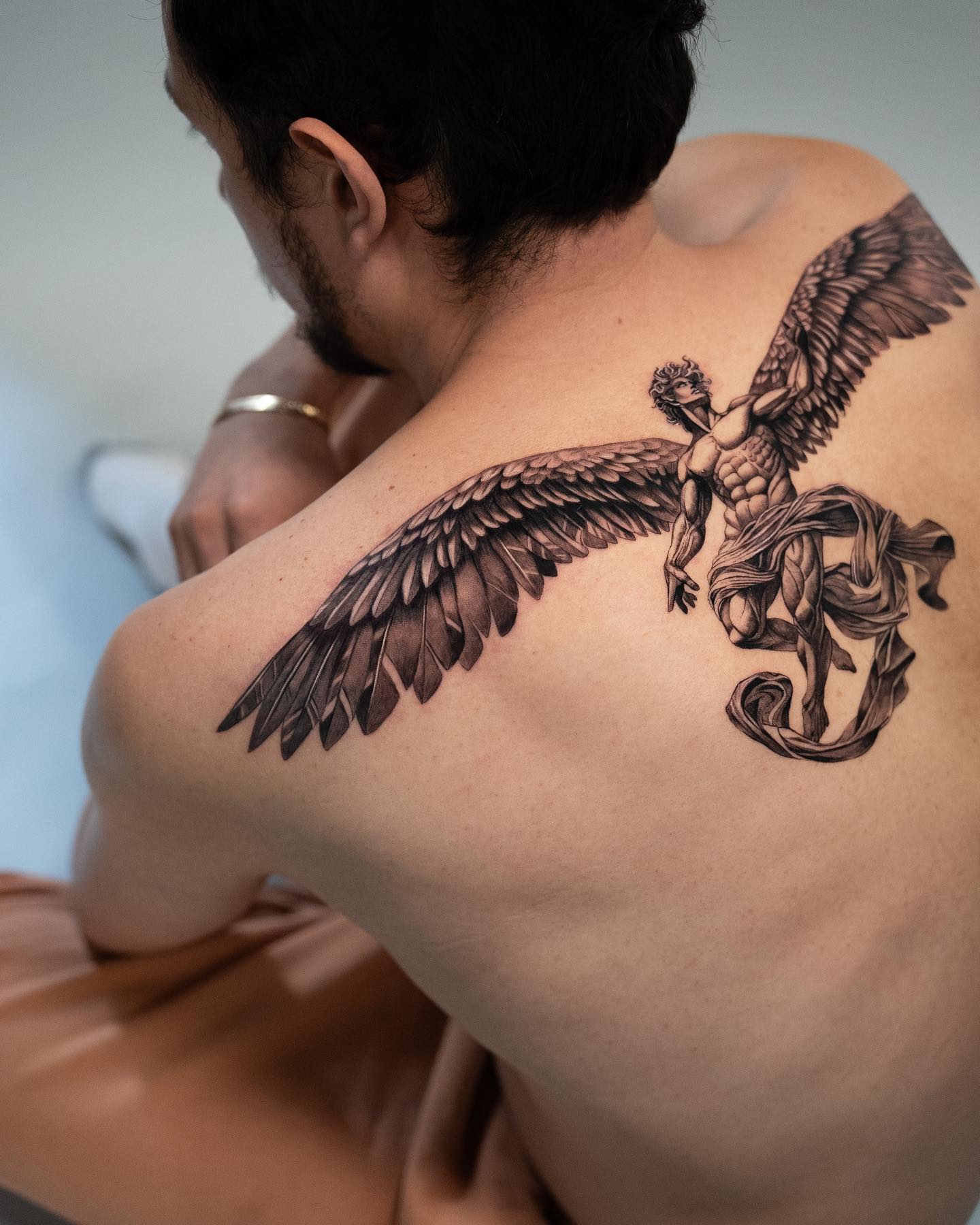 The tattoo features a powerful depiction of a winged figure overcoming an adversary, showcasing intricate details and shading.