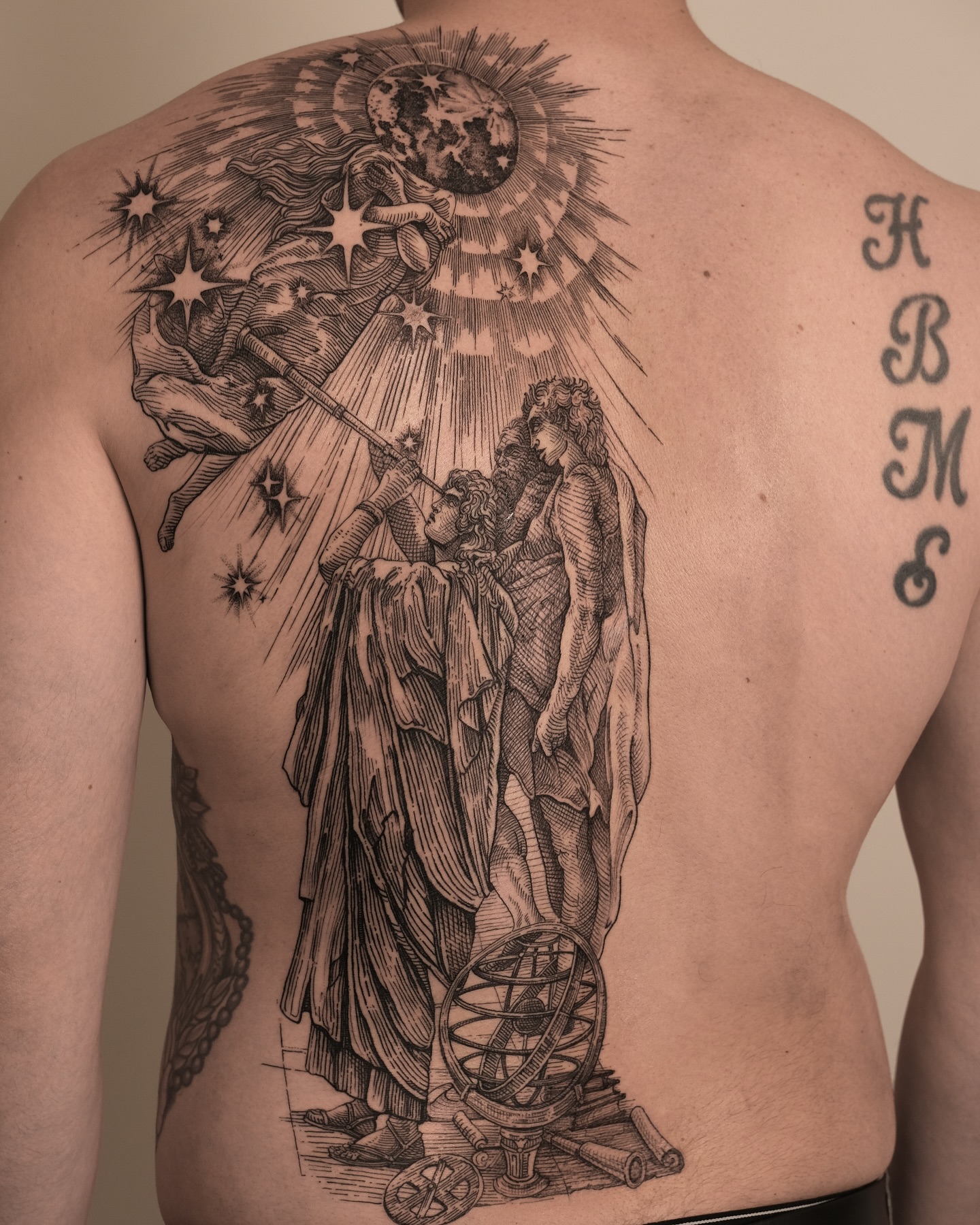 The tattoo features a detailed celestial scene that includes figures looking toward a bright, star-filled sky.