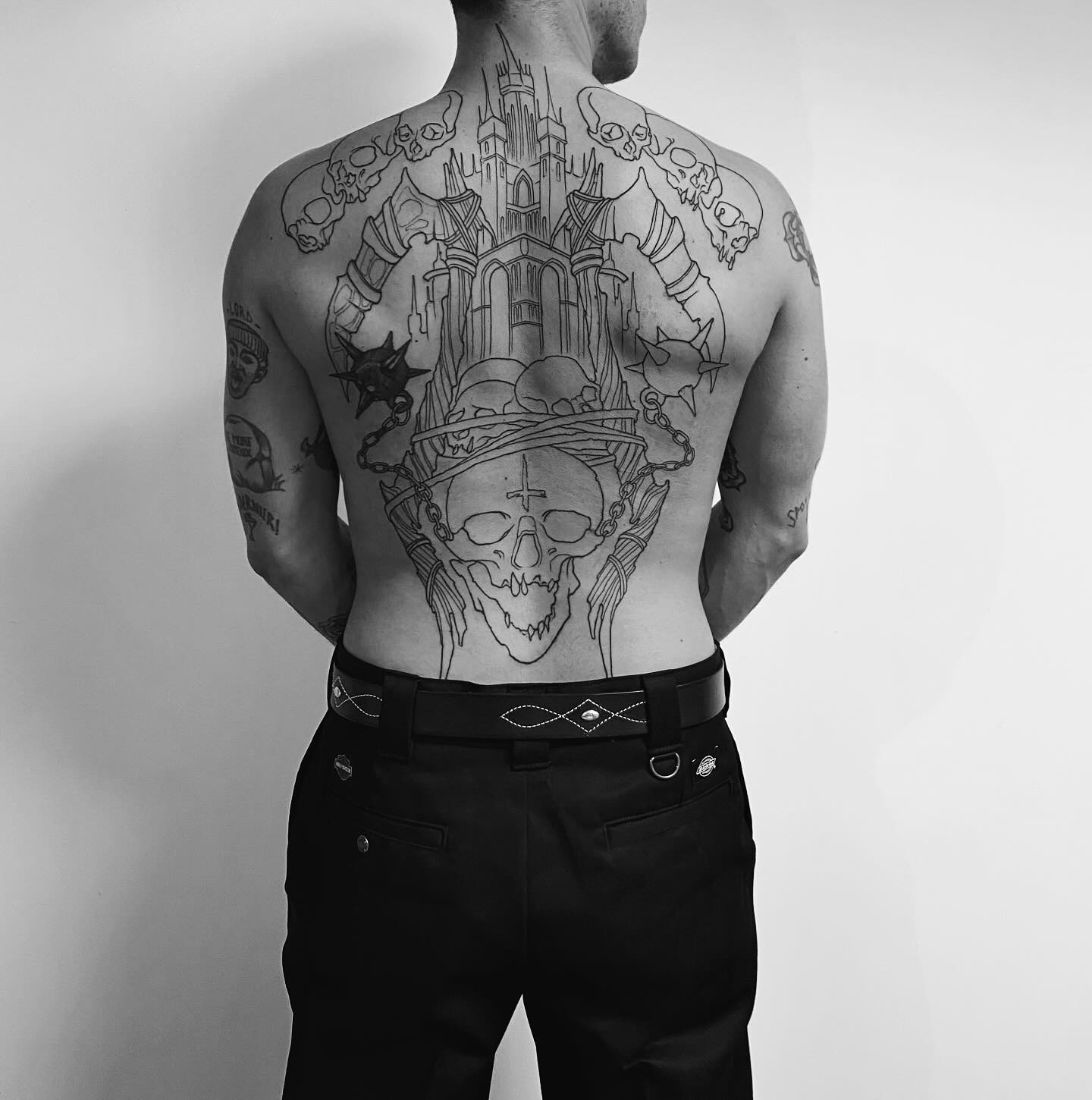 The tattoo features a detailed gothic structure surrounded by skulls, creating a striking visual impact.
