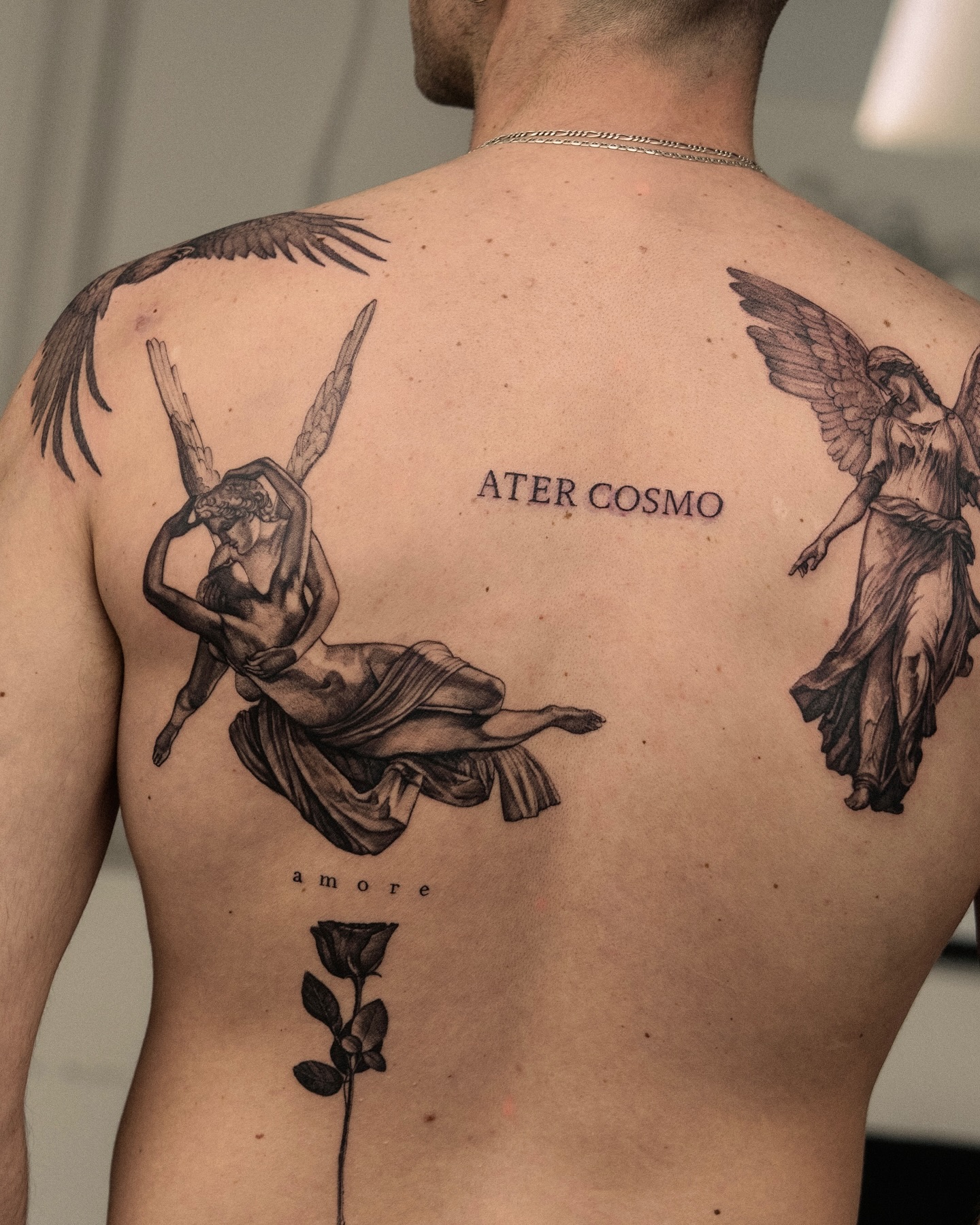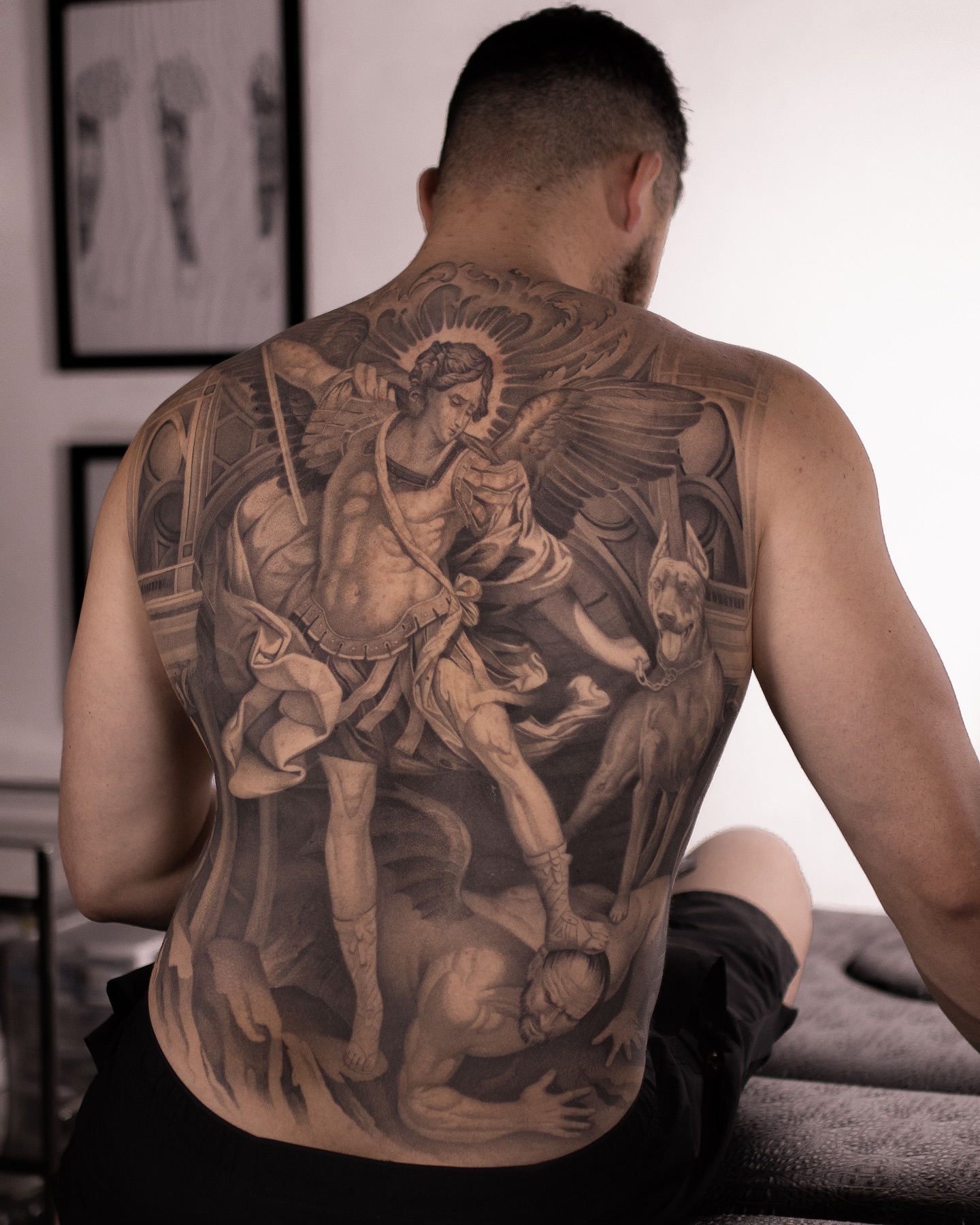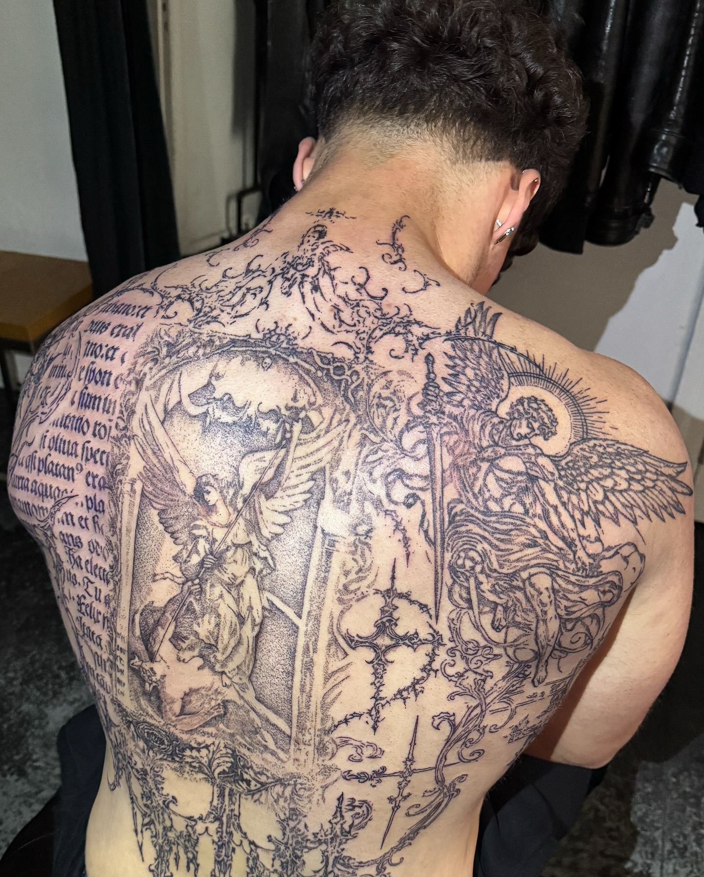 The back tattoo features detailed angelic figures that create a striking visual impact.