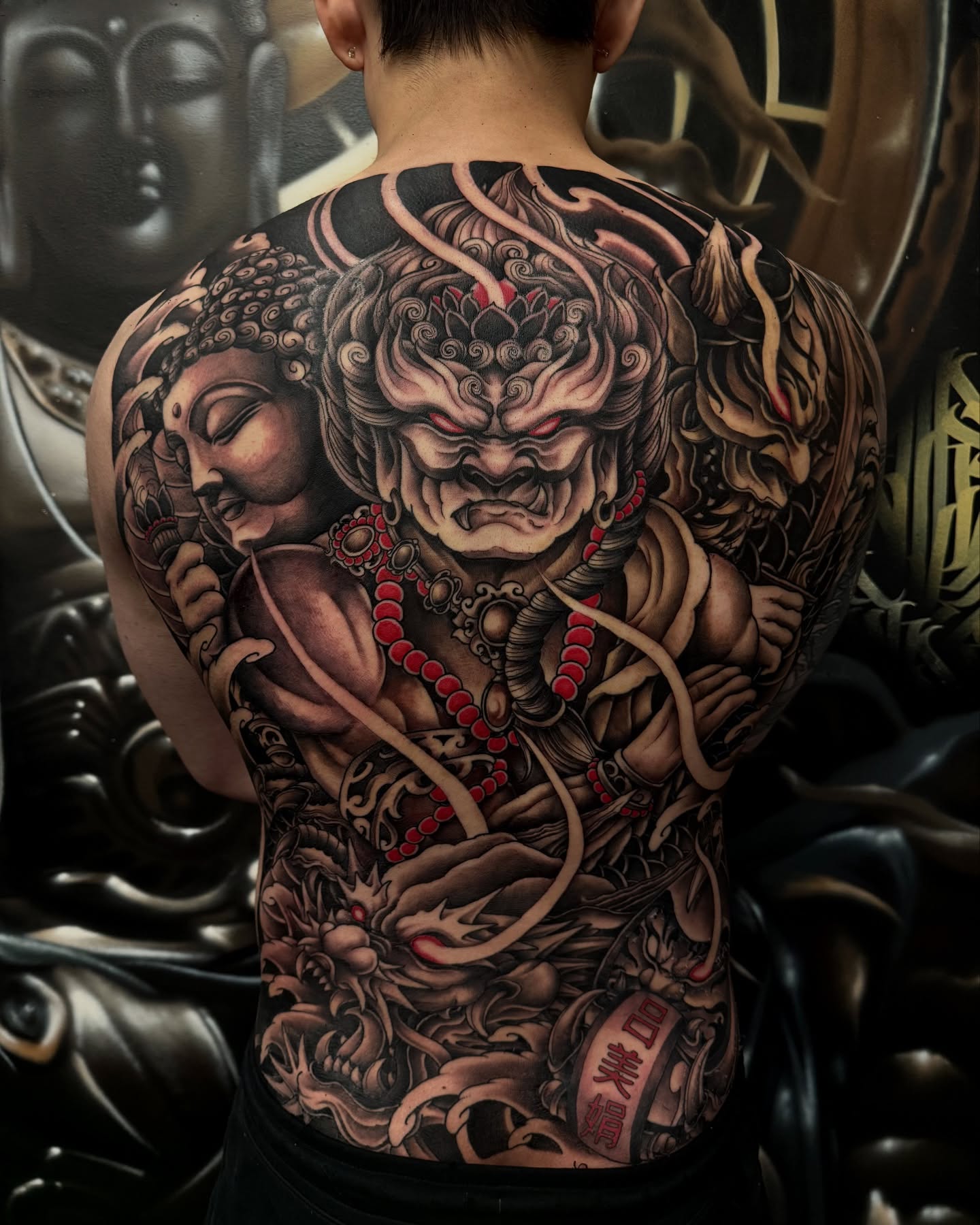 The tattoo features detailed images of a serene Buddha and a fierce guardian figure, creating a striking contrast on the back.