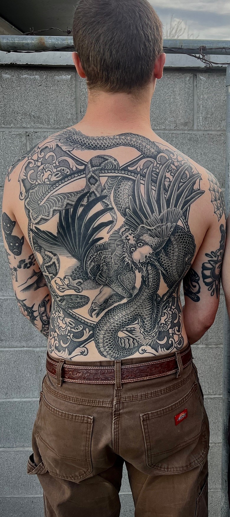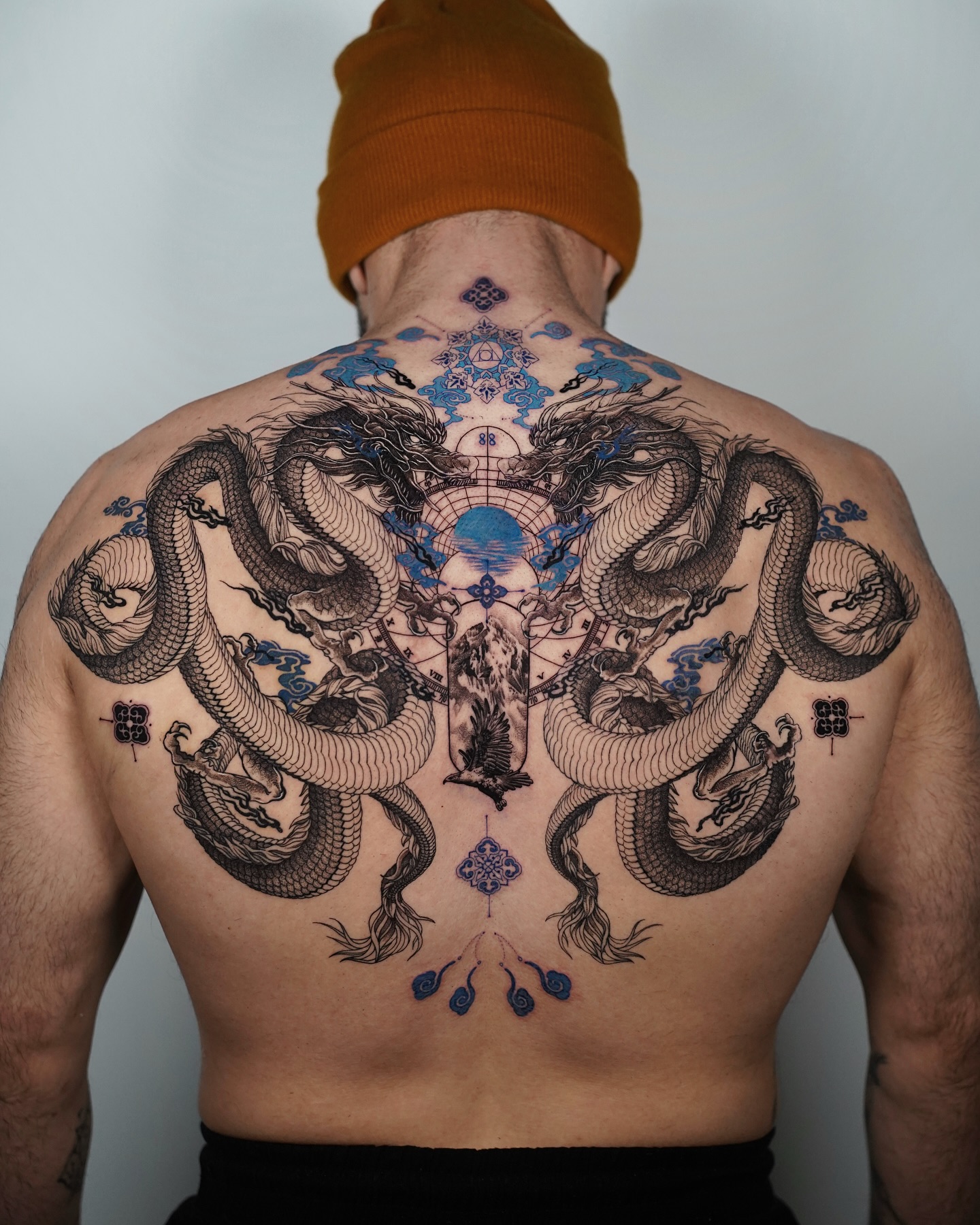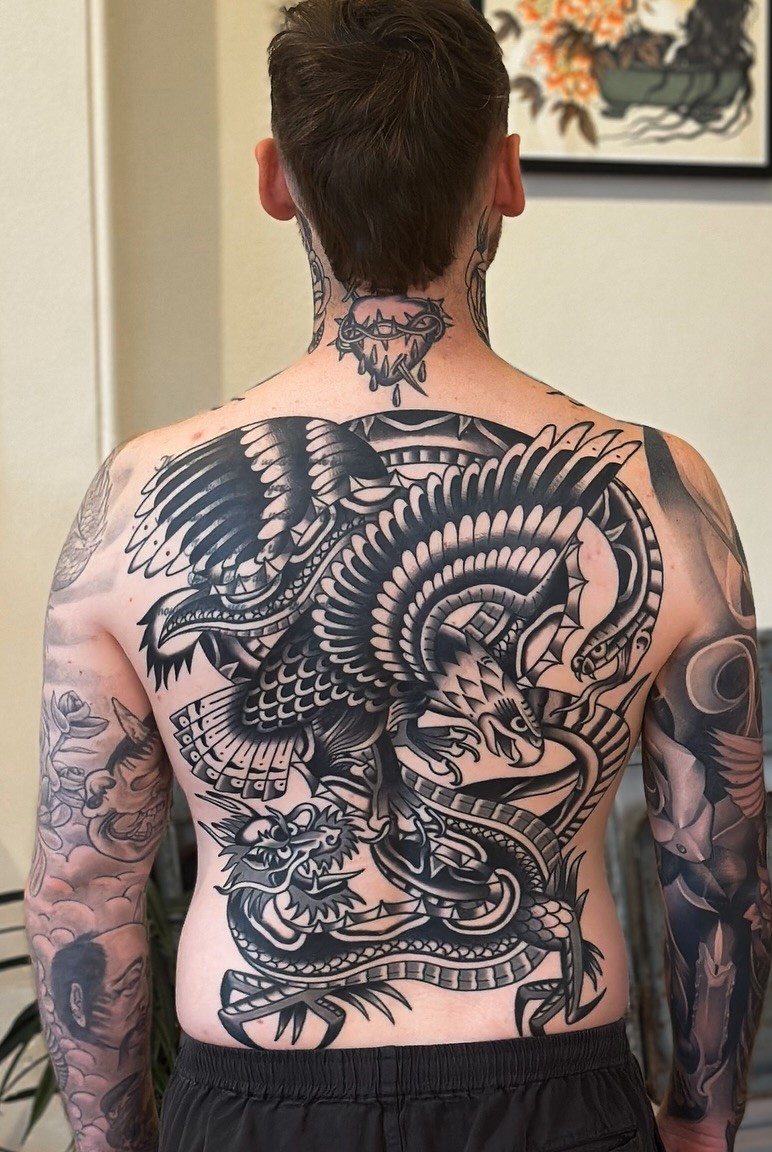 The back tattoo features a striking combination of a dragon and an eagle, each rendered in bold black ink.