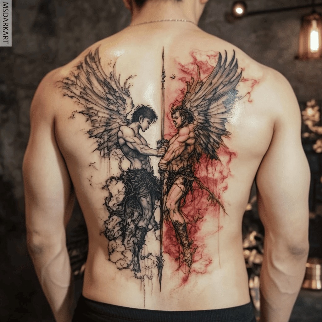 The tattoo features two angelic figures, one in dark ink and the other in vibrant red accents, creating a striking visual contrast.