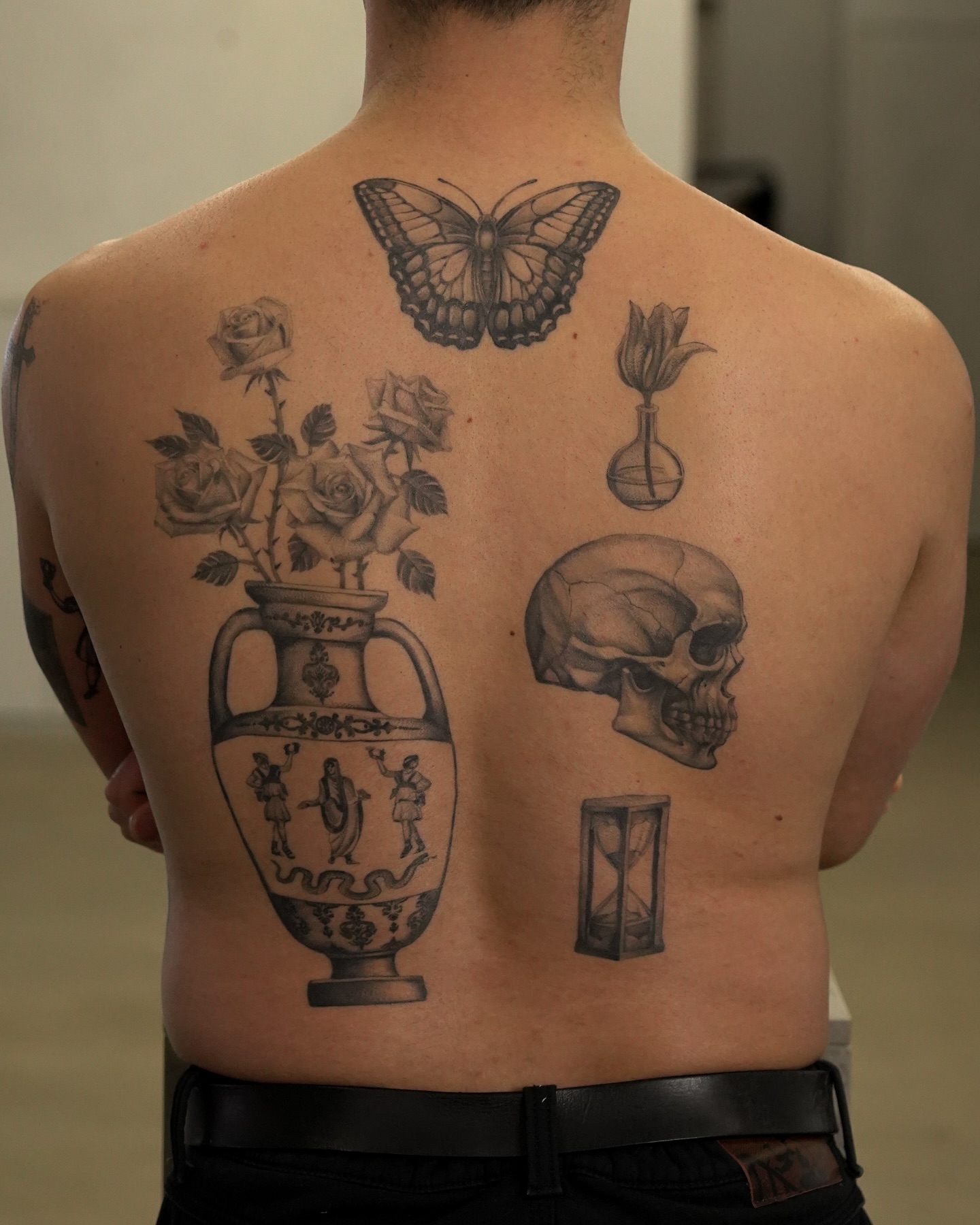The back tattoo features a detailed arrangement of roses, a butterfly, and various symbolic elements like a skull and an hourglass.