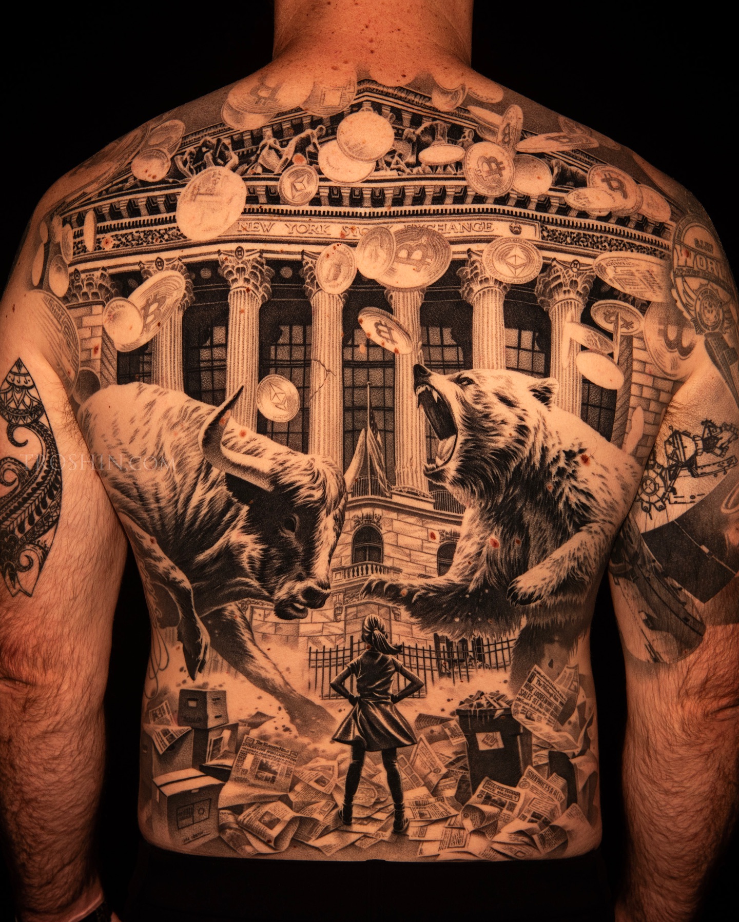 A striking back tattoo features a detailed scene representing the financial market, showcasing a bull and a bear alongside a depiction of the New York Stock Exchange.