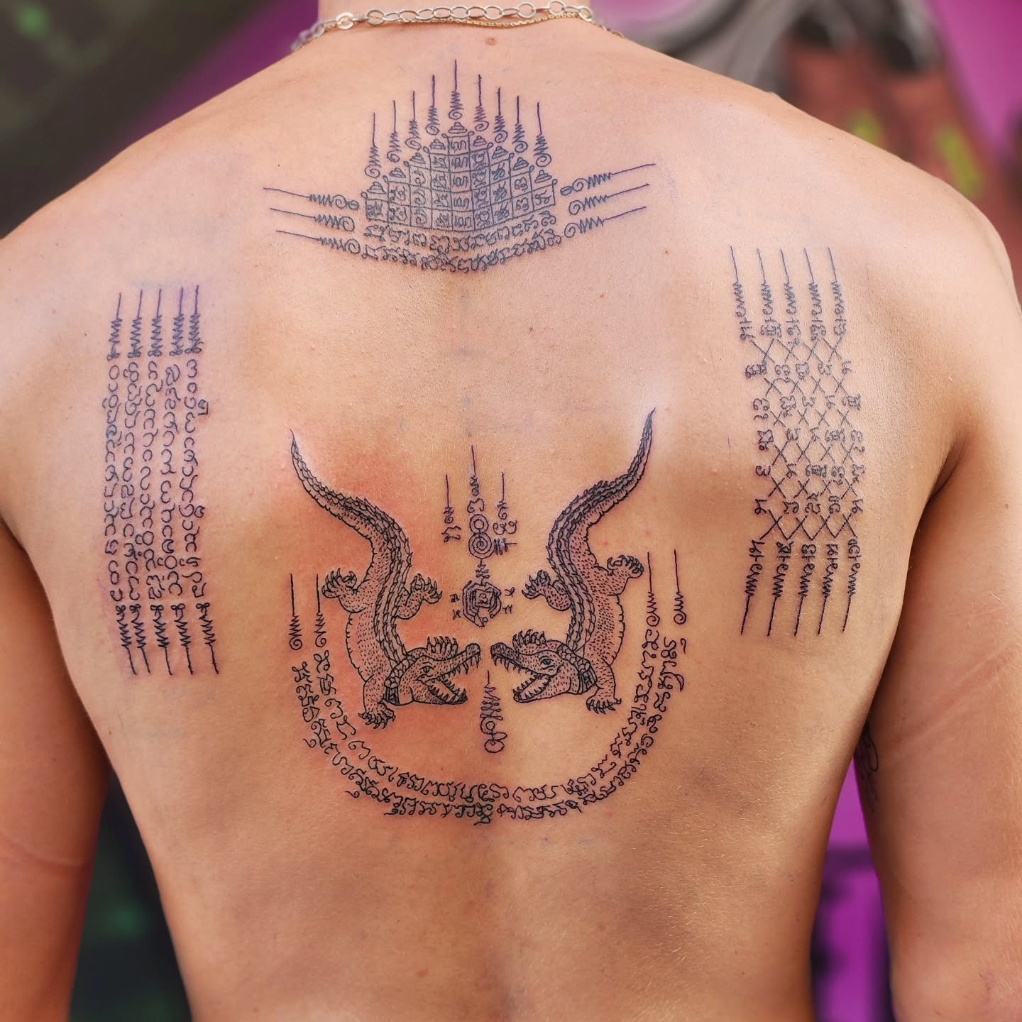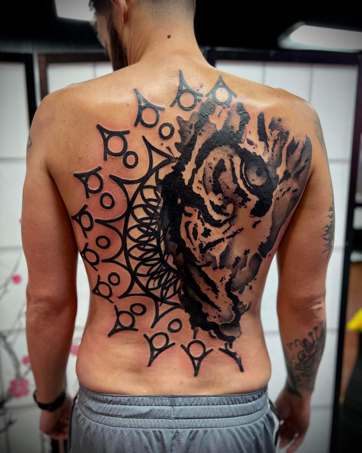 This striking arrangement combines bold lines and shading techniques to create depth and movement, drawing the viewer’s eye across the entire back.