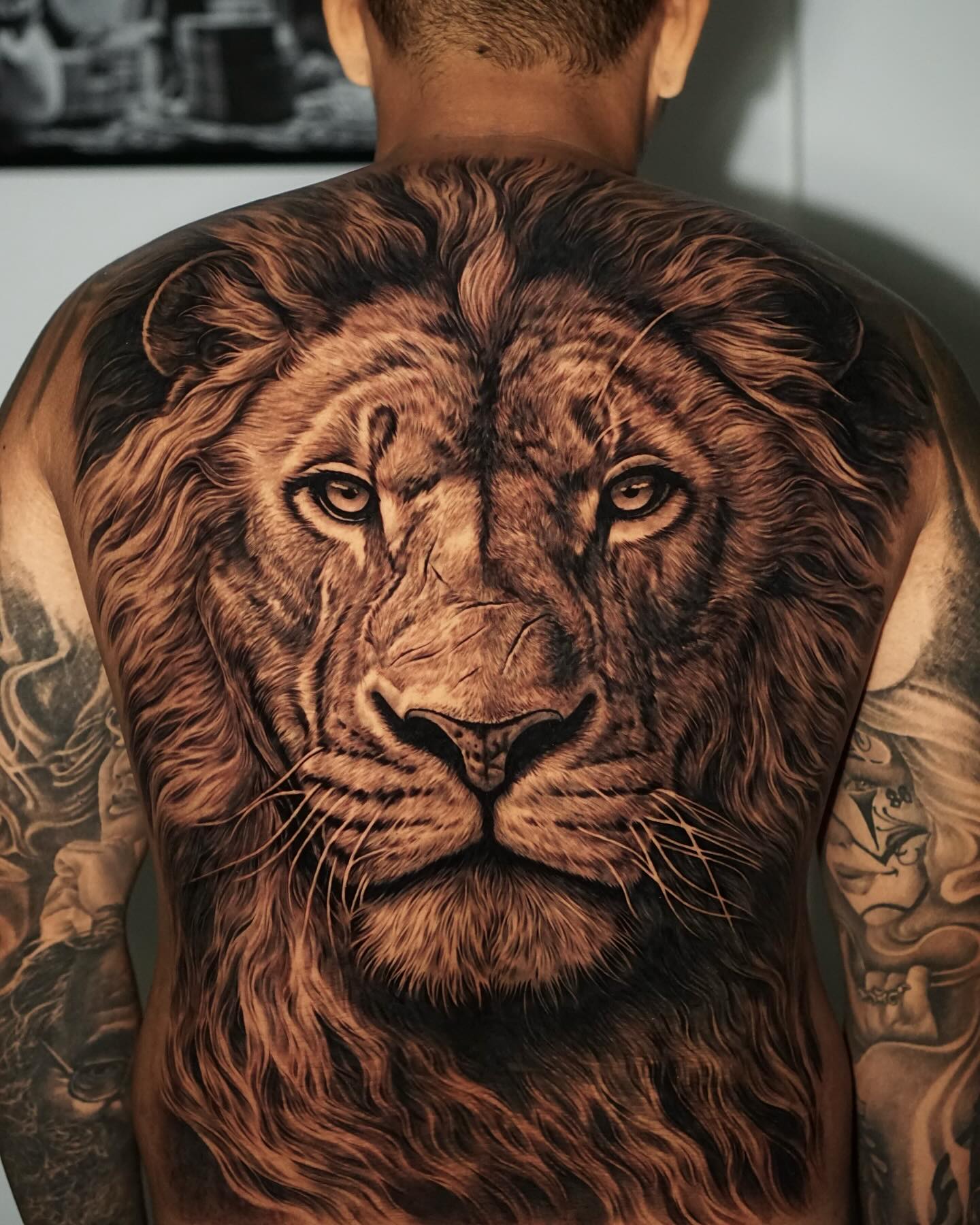 Skilled shading and intricate line work create depth in the lion’s mane and facial features, highlighting the craftsmanship involved in this design.