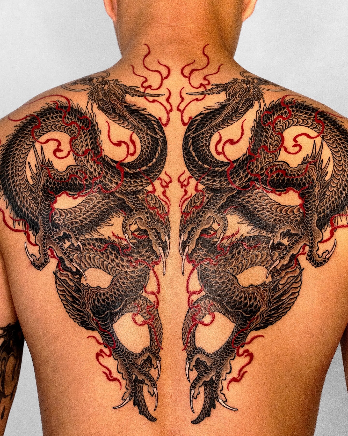 The tattoo features two symmetrical dragons that dominate the back, intricately designed with detailed scales and fierce expressions.